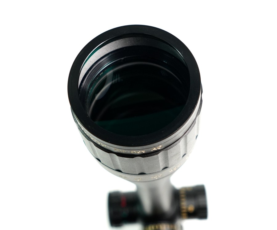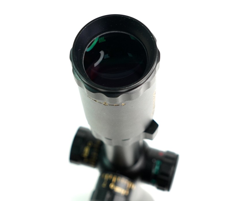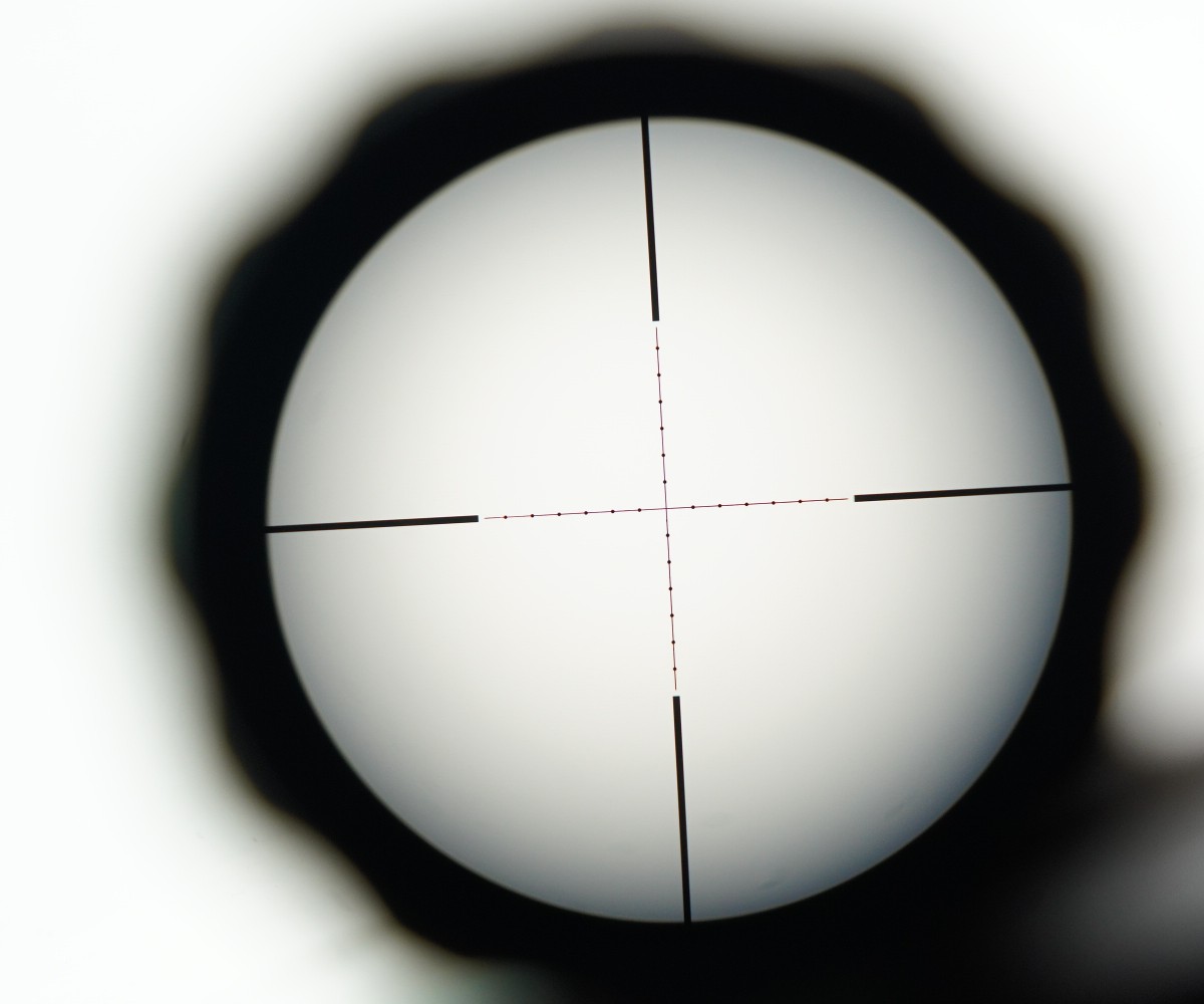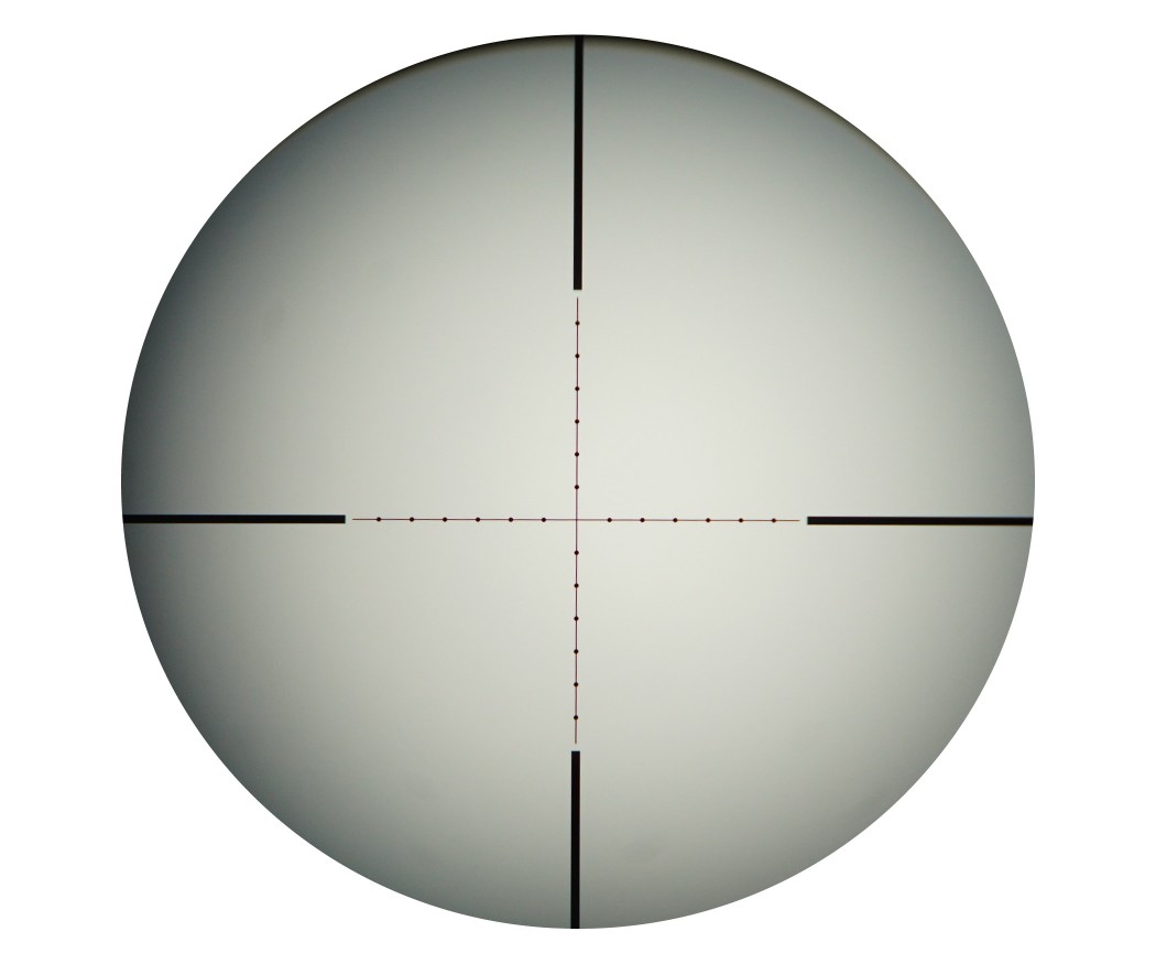 Тип прицельной марки – Мил-Дот, она нанесена на стекло гравировкой и имеет двухцветную подсветку (цвет красный и зеленый), с регулировкой степени яркости. Использование данного типа сетки позволяет стрелкам с опытом быстро оценить удаленность цели. Отстройка прицела производится с помощью щелчкового механизма, один клик поправок - 1/8 МОА. Предусмотрена отстройка от параллакса, механизм находится на объективе прибора.