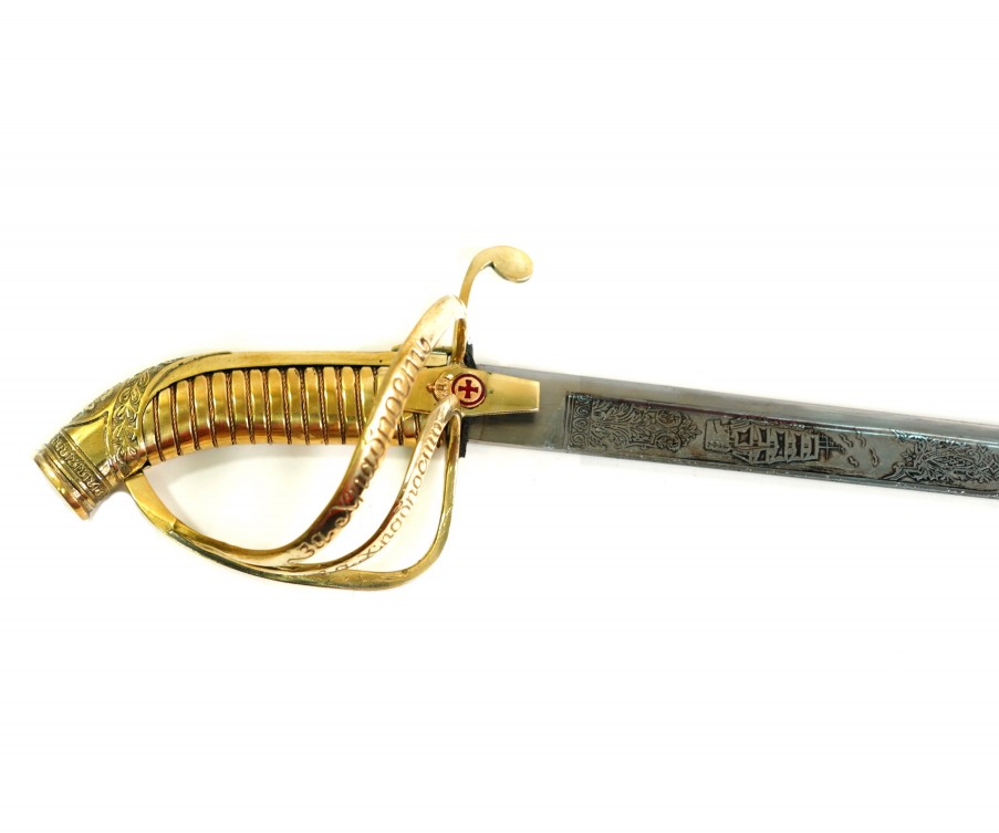 Гарда образована латунной передней дужкой, переходящей внизу в овальную чашку, с тремя боковыми дужками, с шариками, с внешней стороны. Крестовина заканчивается слегка загнутым вниз окончанием. Ножны из стали, прямой формы, овальные. Прибор ножен состоит: из плоского устья на двух винтиках, двух гаек, с подвижными кольцами и фигурного башмака.