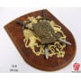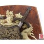 На панно с 2 мечами и кирасой представлены знаковые предметы, увековеченные в истории и обросшие за многие века загадочными историями, легендами и гипотезами.