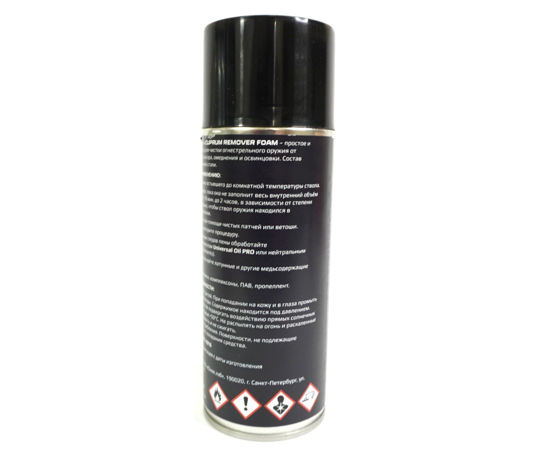 Cuprum Remover FOAM - пена для комплексной обработки оружия, давно не подвергавшегося очистке. Растворяет пороховой нагар, свинец и медь, а также любые другие элементы, кроме сталесодержащих.