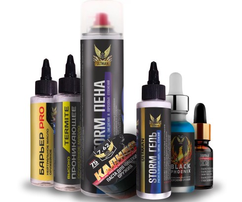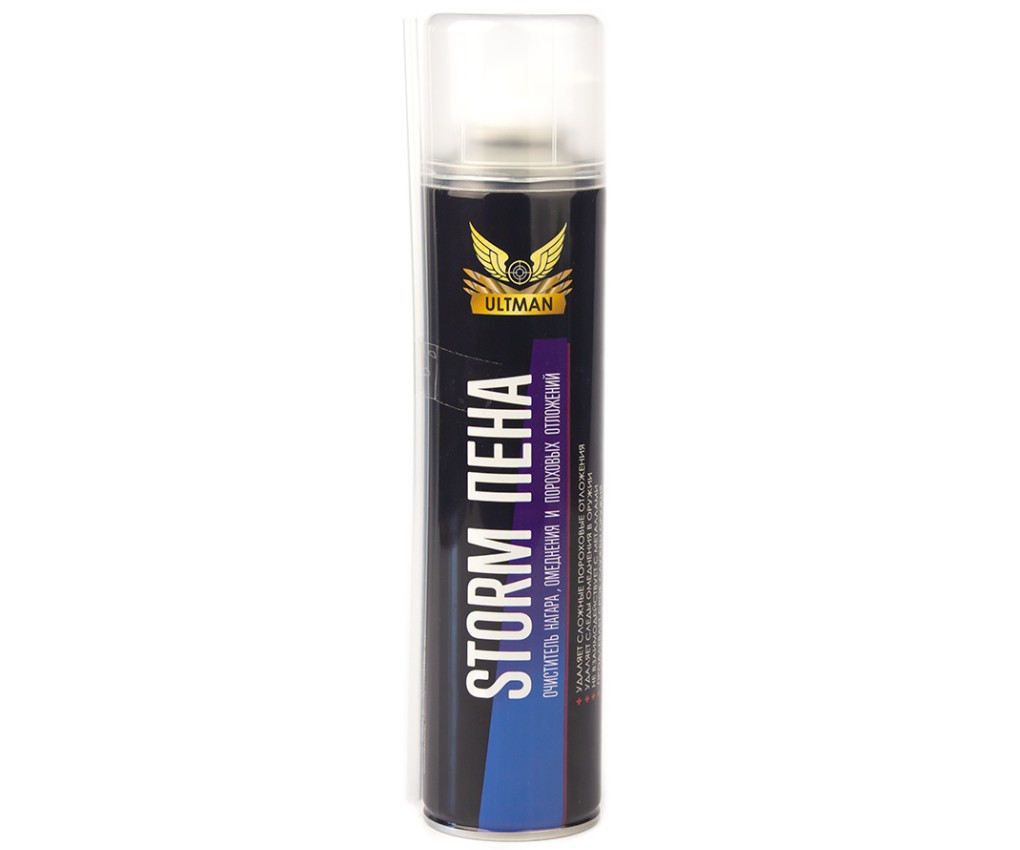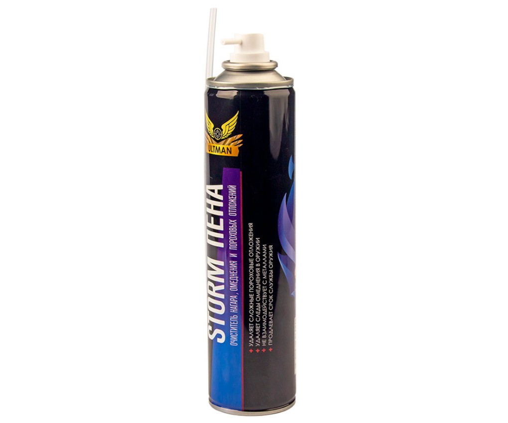 Пена Ultman «Storm» предназначена для устранения самых сложных пороховых отложений, нагара, следов омеднения и прочих загрязнений на внутренней части канала ствола и внутри ДТК. Состав пены не взаимодействует с металлами и их структурой, что делает её безопасной в применении. В комплекте к баллону с пеной идёт пластиковая прозрачная трубка длиной 23 см для более удобного введения пены внутрь канала ствола.