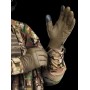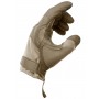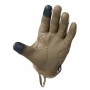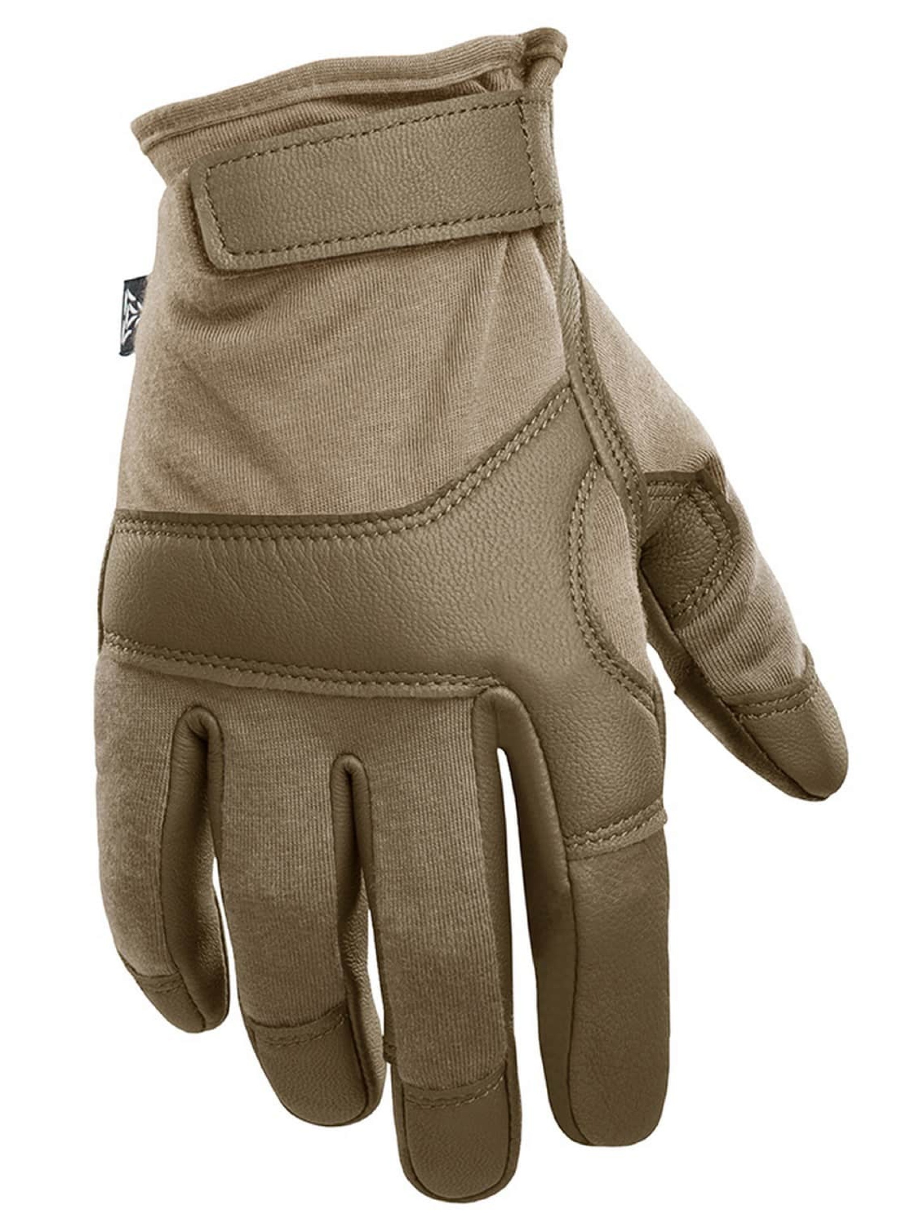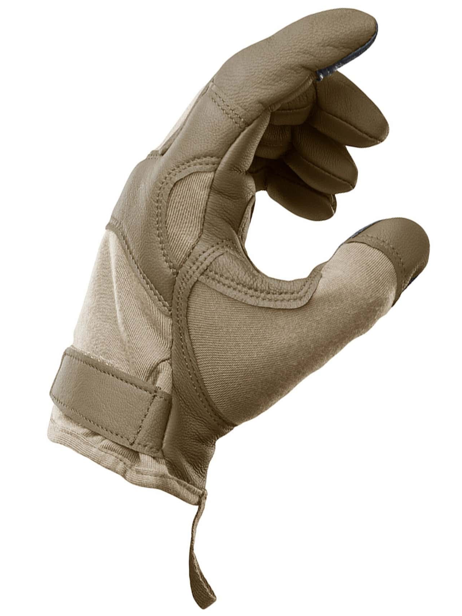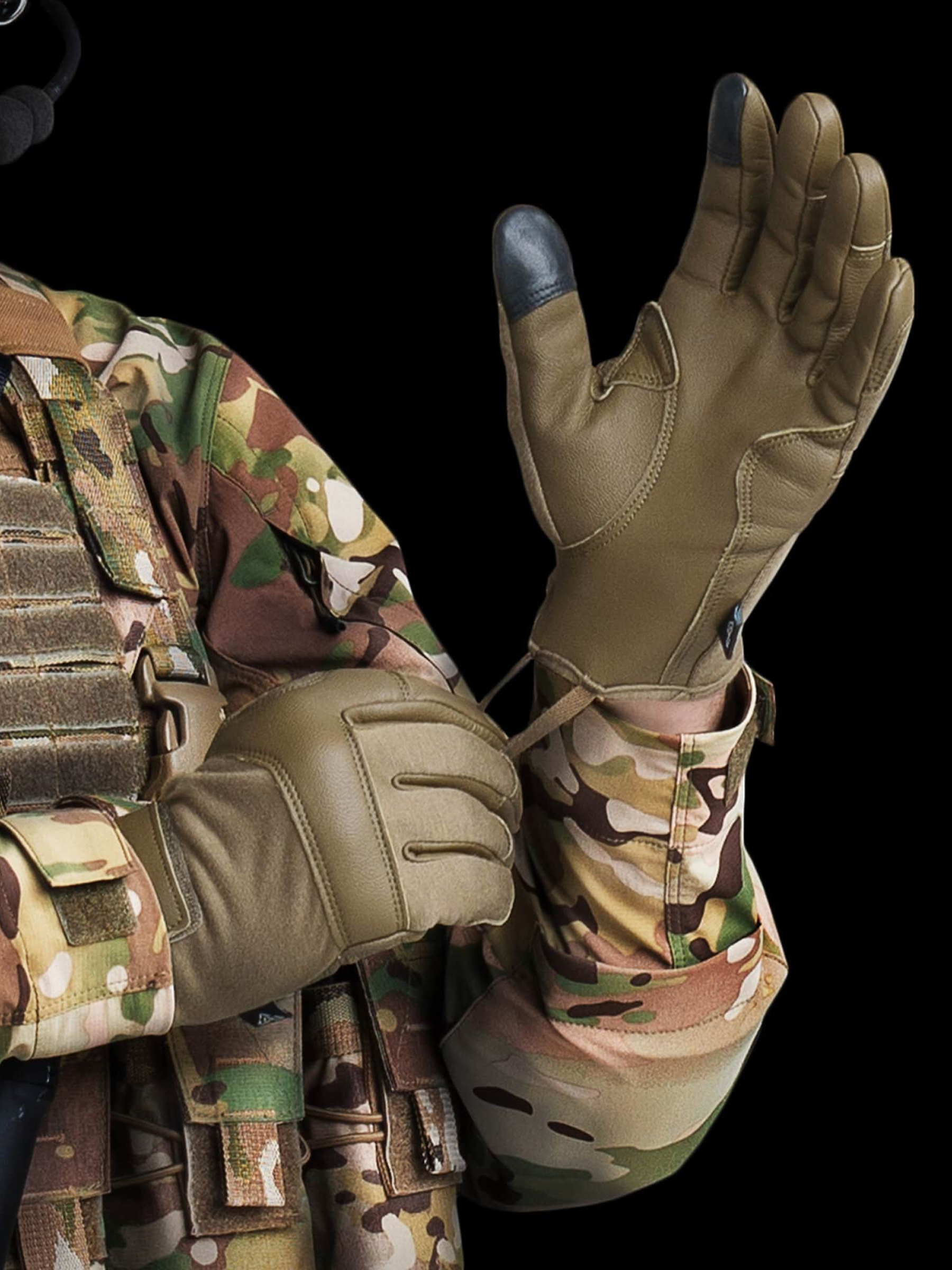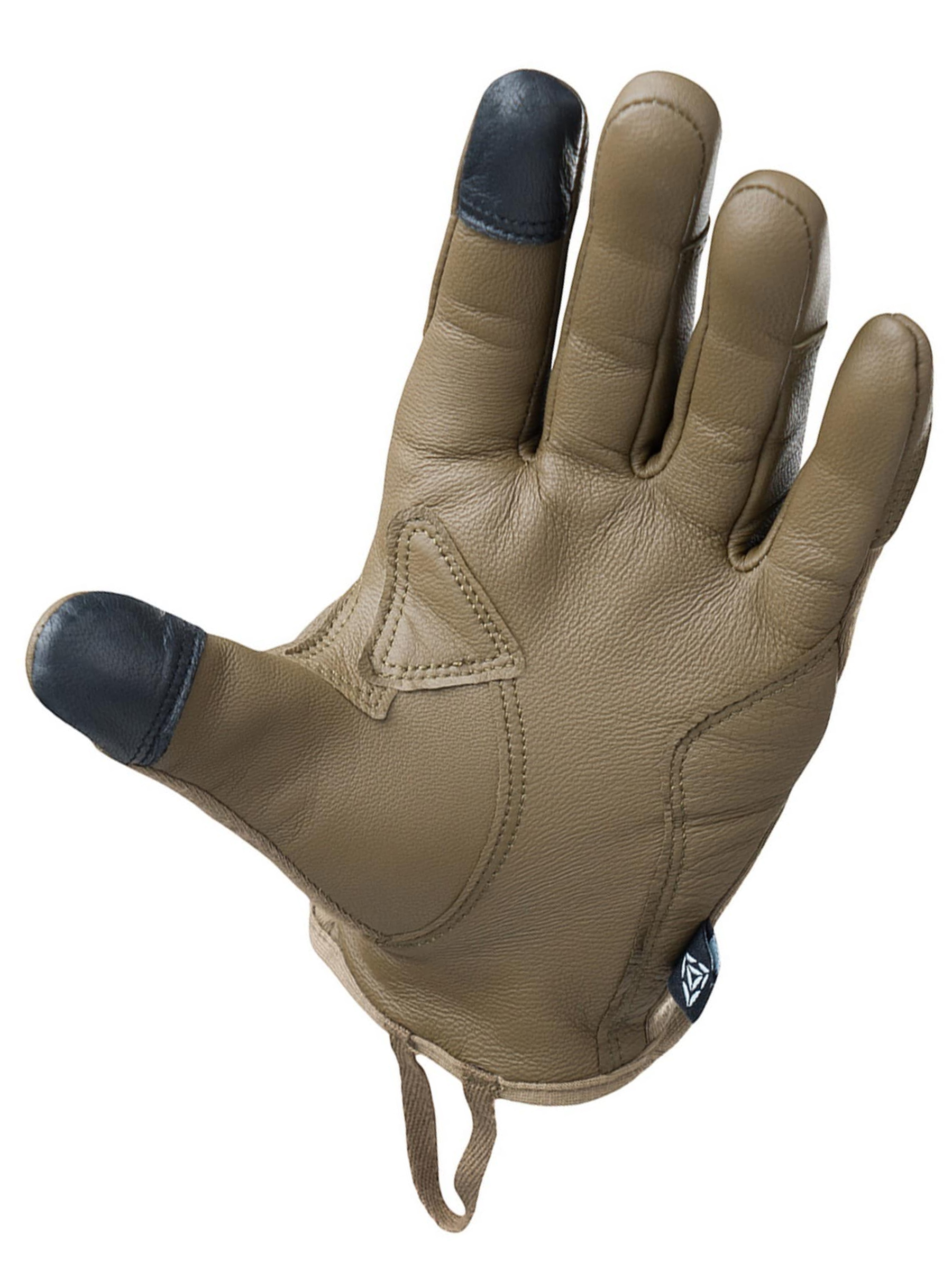 Модель имеет зонированную конструкцию – ладонь, внутренняя и боковая поверхности пальцев изготовлены из прочной козьей кожи, а область тыльной стороны ладони и запястья – из двух слоев негорючего трикотажа. Натуральная кожа обладает высокой износостойкостью, что адаптирует изделие для использования его в условиях тяжелых работ. Эластичные материалы и сложный анатомический крой обеспечивают эффективный хват и сохраняют точность движений при работе с оружием и экипировкой. Вставки из электрокондуктивной кожи на указательном и большом пальцах позволяют работать с сенсорными экранами различных типов.