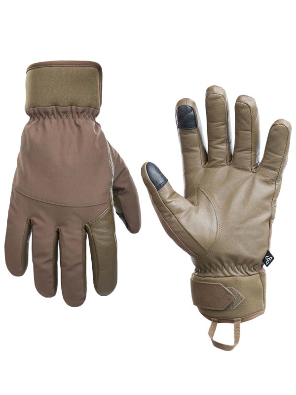 Перчатки обладают полной водонепроницаемостью за счет применения герметизированного мембранного вкладыша из гидрофильной мембраны с повышенной паропроницаемостью. Эластичная ткань верха и анатомический крой обеспечивают эффективный хват и сохраняют точность движений при работе с оружием и экипировкой. Усиление натуральной козьей кожей защищает ладонь и пальцы. Вставки из электрокондуктивной кожи на указательном и большом пальцах позволяют работать с сенсорными экранами. Изделие обладает теплоизолирующими свойствами благодаря объемной трикотажной подкладке.