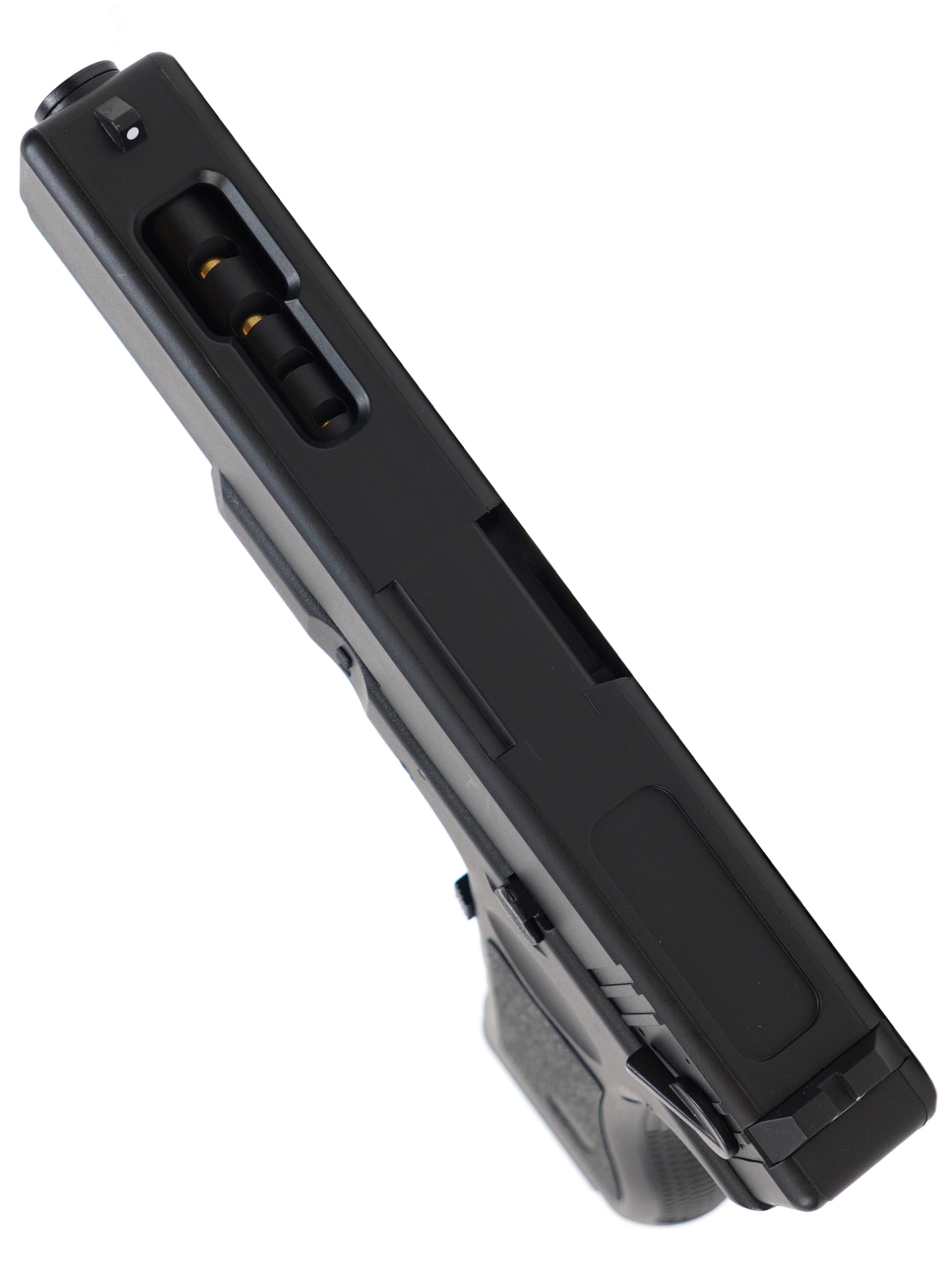 Стреляет пистолет со скоростью до 70 м/с, магазин рассчитан на 28 стандартных боеприпасов для пневматики. Небольшая мощность оружия позволяет обладать им всем желающим с 18 лет.