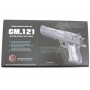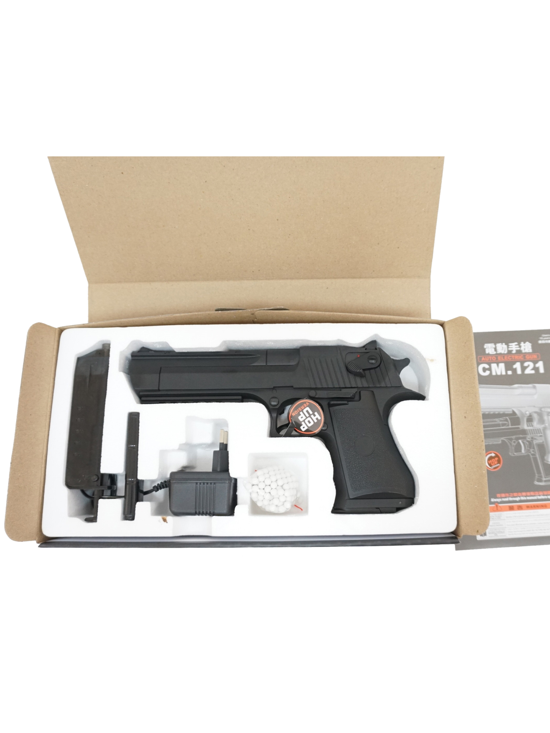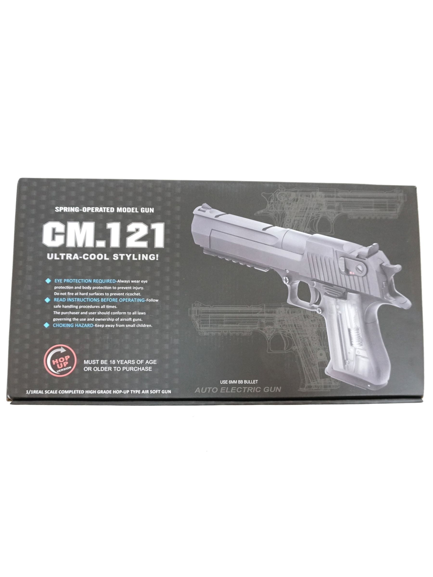 Cyma CM121 - cтрайкбольный пистолет, который способен может вести огонь как одиночными выстрелами, так и в автоматическом режиме. Модель израильского пистолета Desert Eagle, одного из самых крупногабаритных пистолетов. Скорость вылета шара 60-70 м/с, при этом модель обладает хорошей скорострельностью.