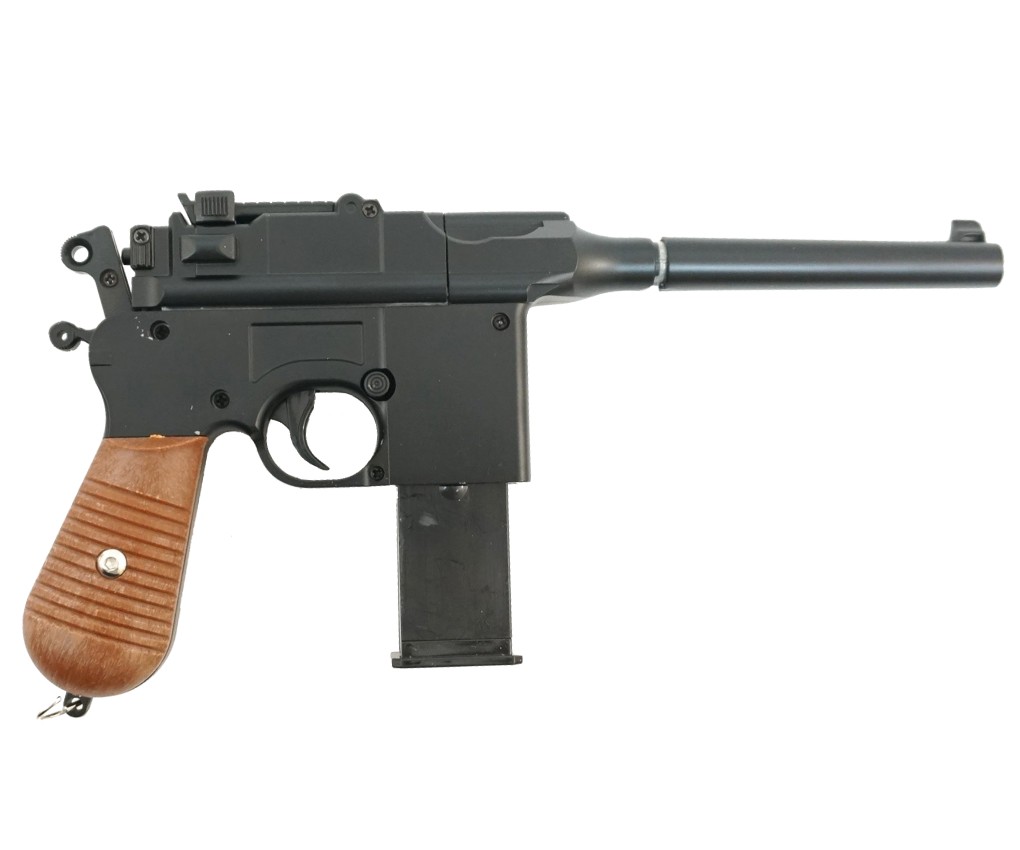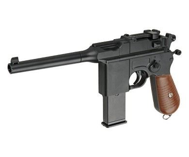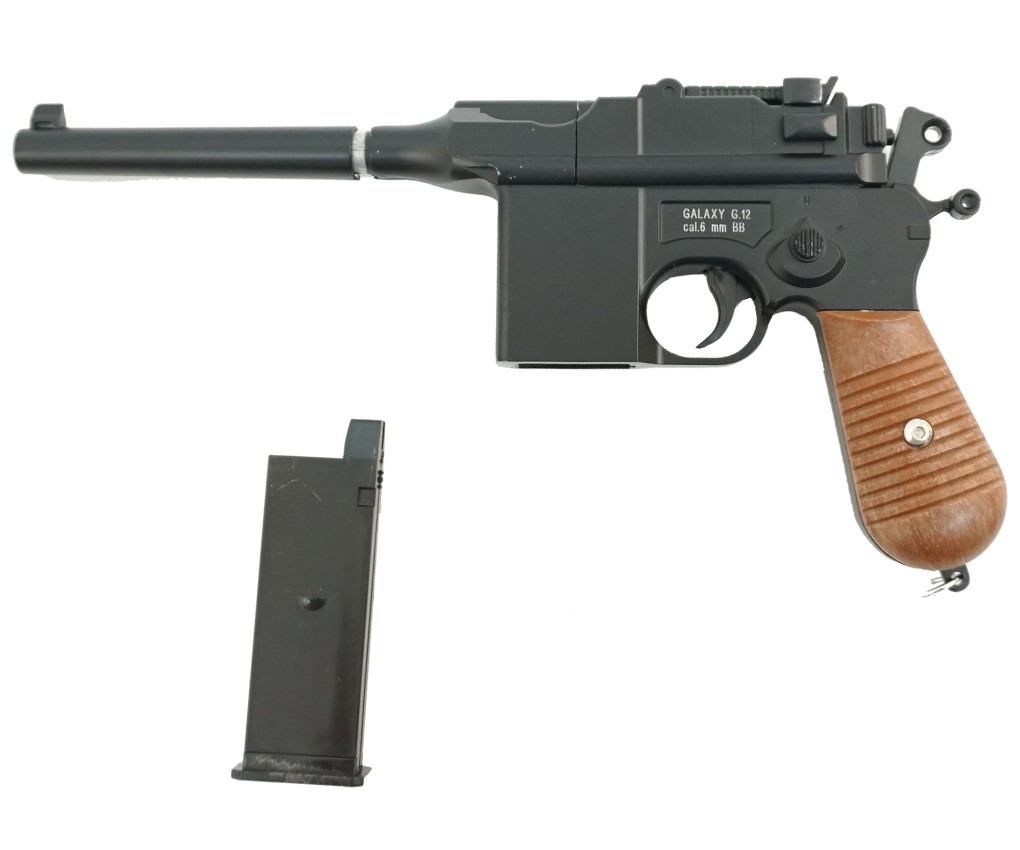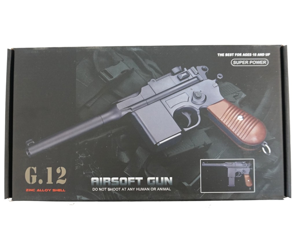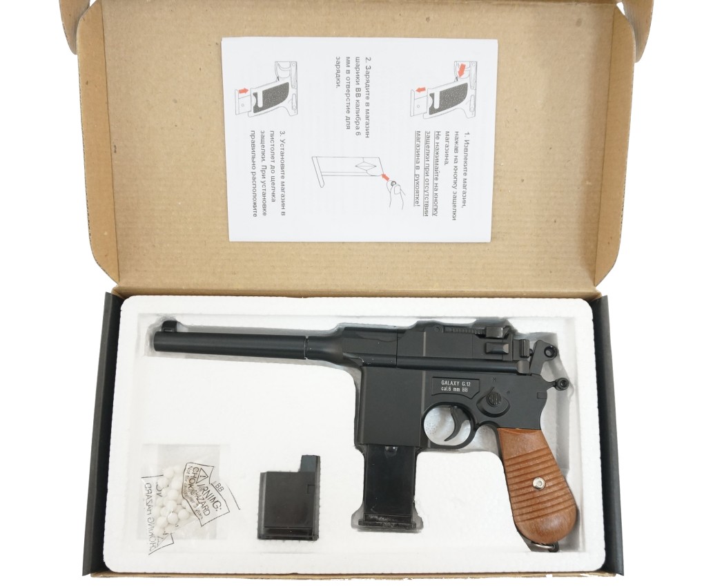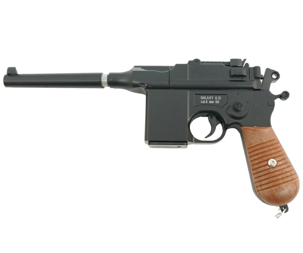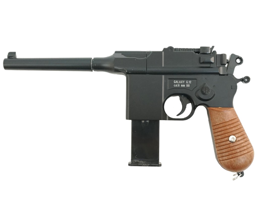 Galaxy G.12 - качественная спринговая страйкбольная модель классического пистолета Маузер, изготовленная из качественного цинкового сплава и пластика. Начальная скорость выстрела шарика 60-69 метров в секунду.