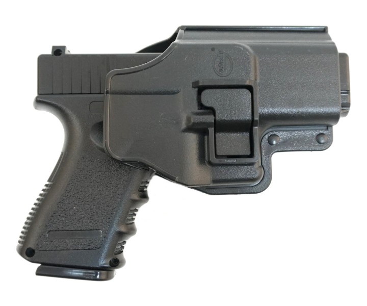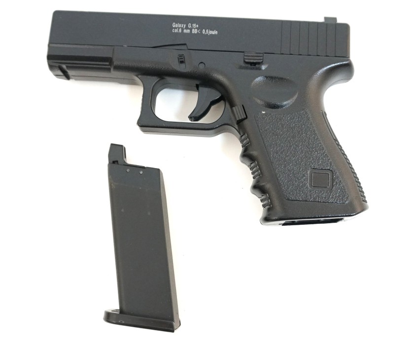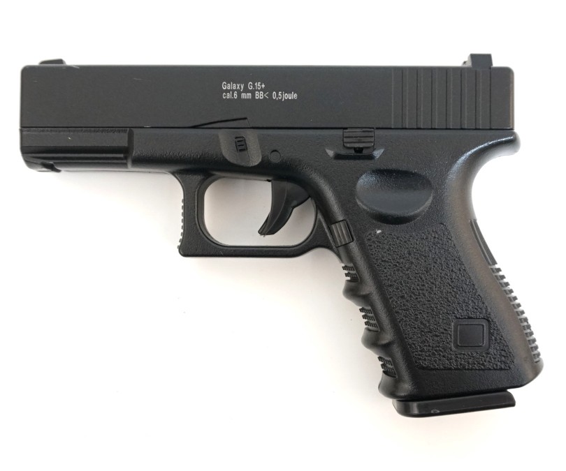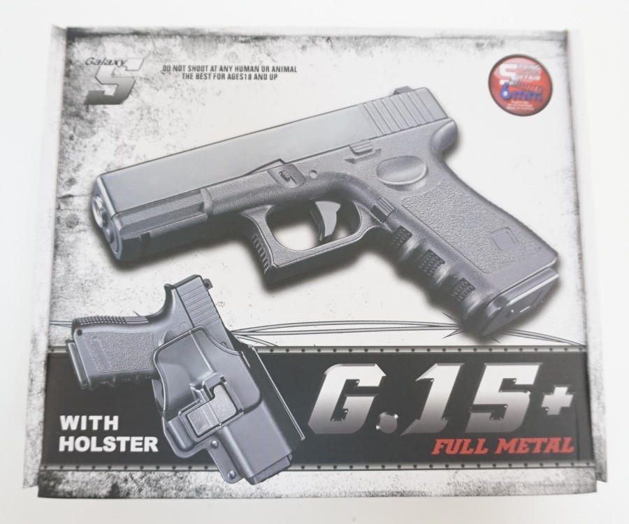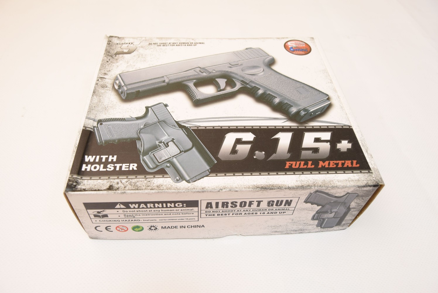 Galaxy G.15+ - качественная спринговая страйкбольная модель классического пистолета Glock 23, изготовленная из качественного цинкового сплава и пластика. Начальная скорость выстрела шарика 70-79 метров в секунду. Он поставляется сразу с кобурой, которая обеспечивает удобство его переноски и использования в качестве дополнительного игрового оружия во время страйкбольных командных соренований.
