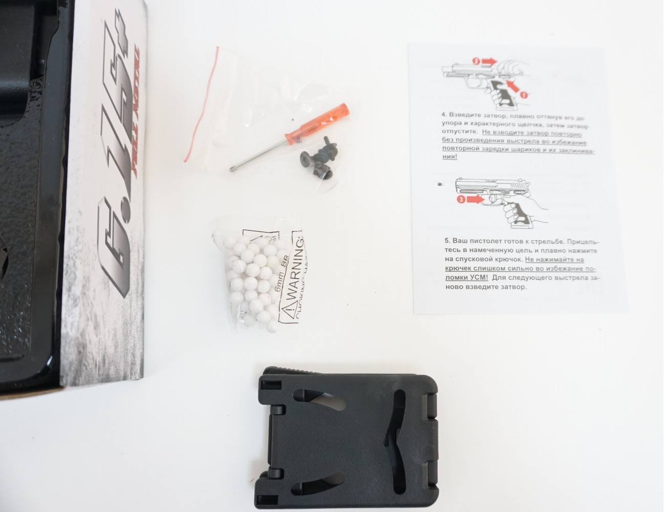Комплектация (?): | пистолет, кобура, скоба, набор для крепления, инструкция, коробка |