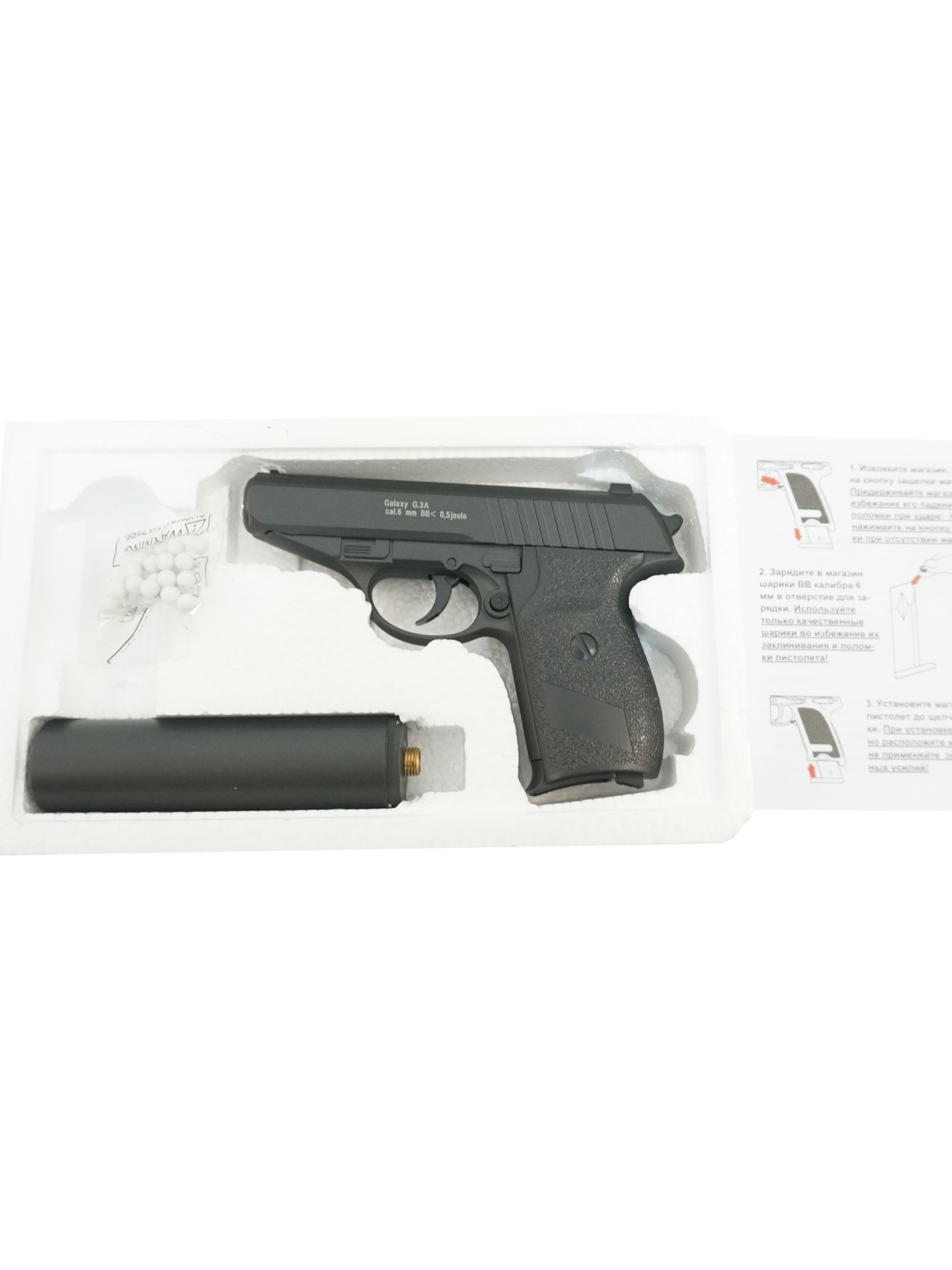 | Комплектация (?): | пистолет, имитатор глушителя, инструкция, коробка |