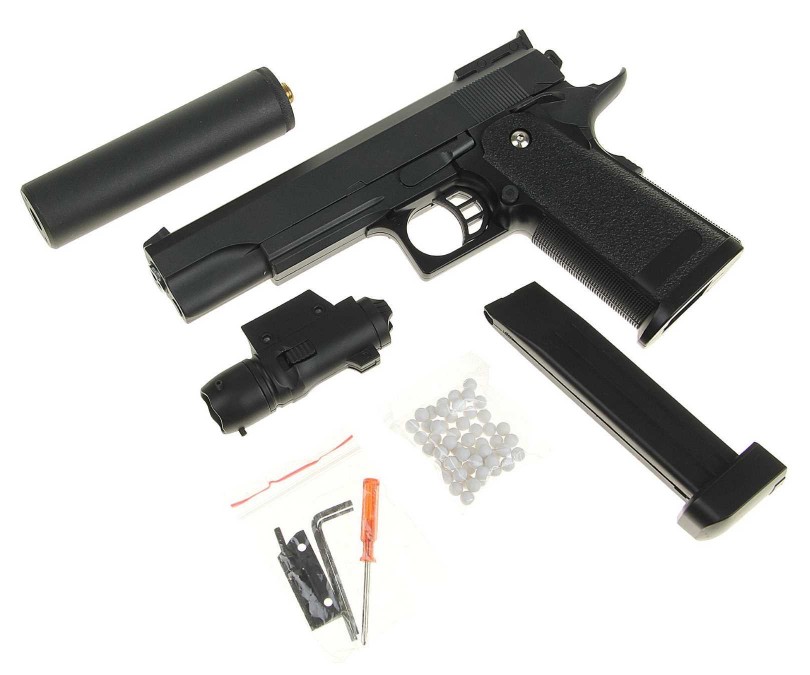 Комплектация (?): | пистолет, имитатор глушителя, лазерный целеуказатель, шарики, шестигранник, инструкция, коробка |