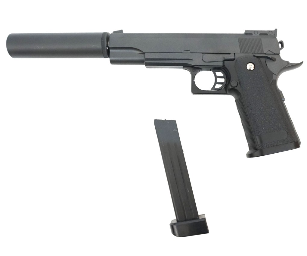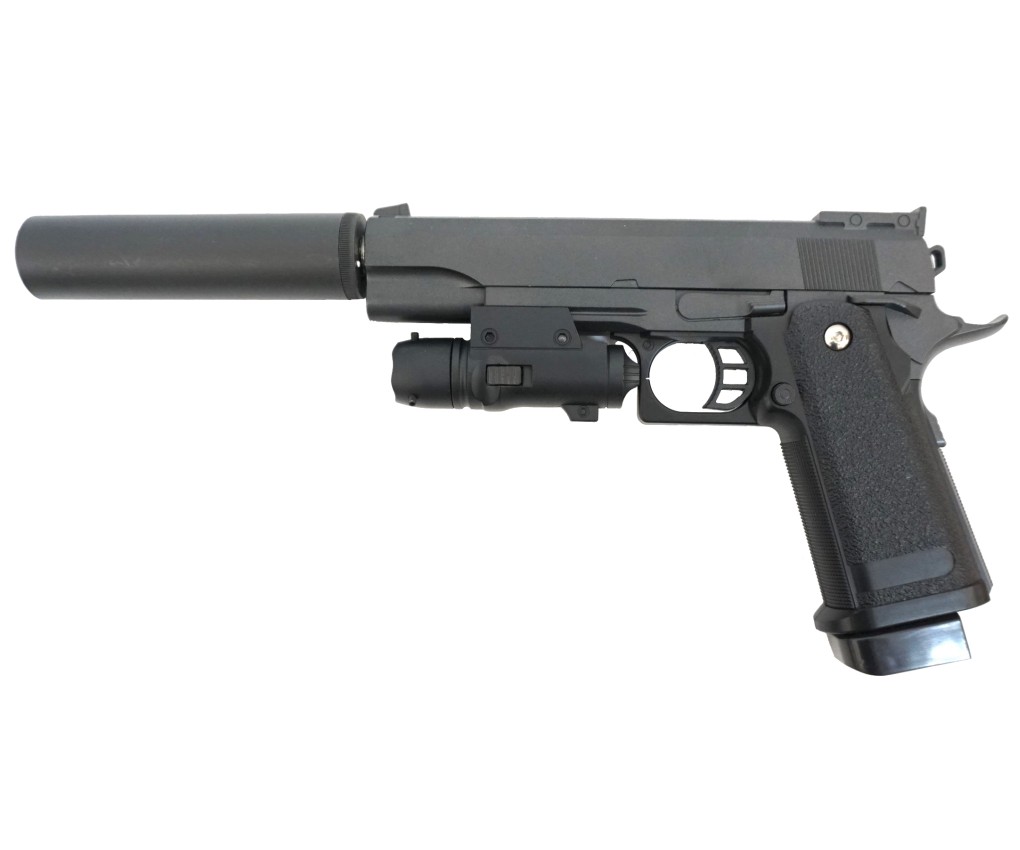 Galaxy G.6A - качественная спринговая страйкбольная модель пистолета Colt 1911 с имитацией глушителя и ЛЦУ, изготовленная из качественного цинкового сплава и пластика. Начальная скорость выстрела шарика 70-79 метров в секунду.