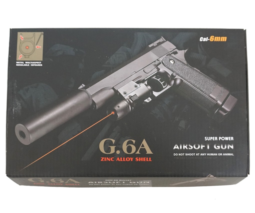 Пистолет страйкбольный Galaxy G.6A Colt 1911 PD с глушителем и ЛЦУ представляет собой точную копию боевого американца Colt 1911 PD, который широко используется полицией и военными этой страны. Это игрушечное оружие характеризуется весьма высокими характеристиками и долговечностью, а также оснащено магазином на 12 патронов, что выгодно отличает его среди восьмипульных пистолетов для ведения прицельной стрельбы одиночными выстрелами во время страйкбола. Дополнительное наличие глушителя делает его использование по-настоящему тихим и незаметным, что часто необходимо для победы в игре.