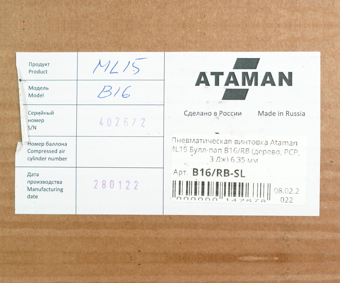 Комплектация (?): | винтовка, заправочный штуцер, паспорт (инструкция) |