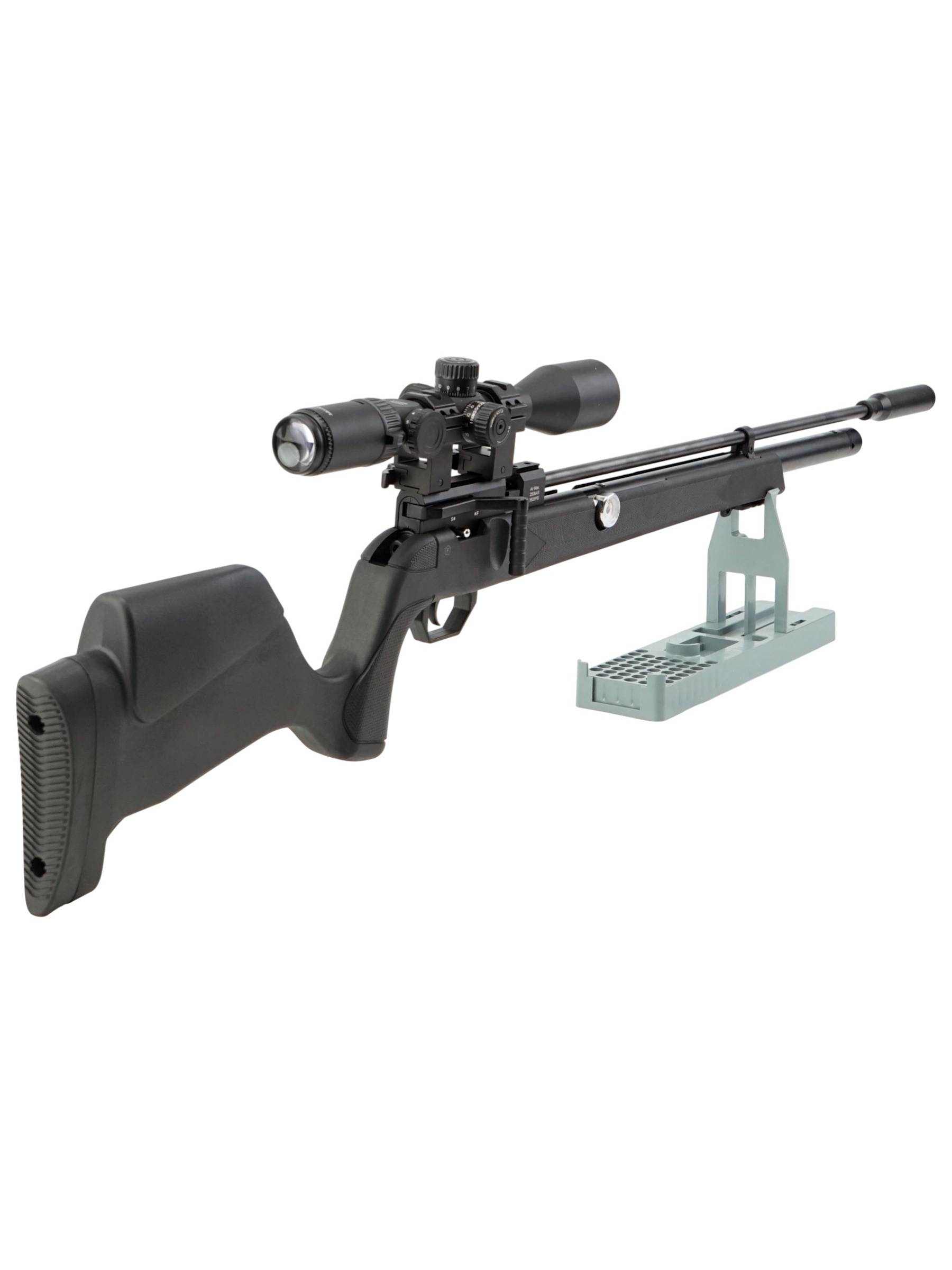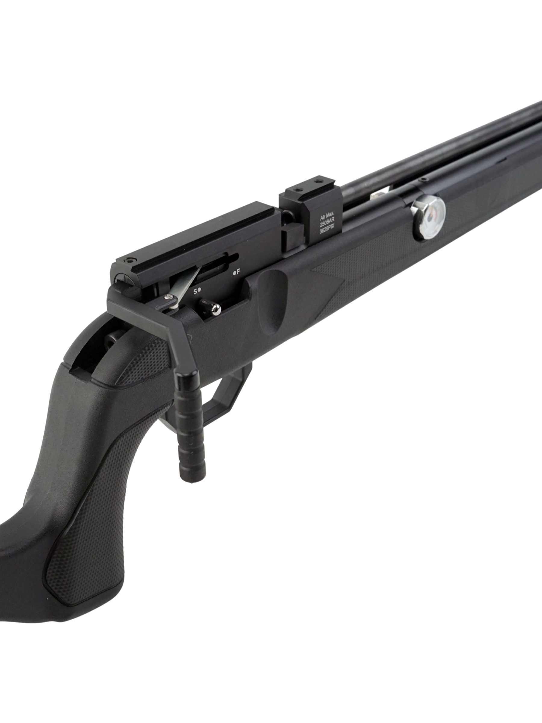 Резервуар высокого давления закачивается с помощью заправочного штуцера, а для взведению используется боковой биатлонный механизм, что делает процесс зарядки максимально удобным и быстрым. Винтовка оснащена барабан-клипом на 8 пуль, что позволяет вести серию выстрелов без постоянной перезарядки. В режиме одиночного выстрела есть регулируемый спусковой механизм и предохранитель для обеспечения безопасной стрельбы.