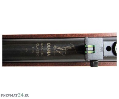 Приклад модели Diana 240 F Classic обладает практичной, удобной конструкцией, а произведен из ценного дерева высокого качества. Затыльник приклада выполнен из резины, чем способствует амортизации вибрации и отдачи. Ствол прибора сделан из стали с наличием точных нарезов внутри, что сопутствует развитию скорости пули, ее хорошей кучности, меткости. Данная часть винтовки имеет длину - 420 мм, а калибр - 4,5 мм. Общая длина ружья составляет 1030 мм с весом в 2,6 кг.