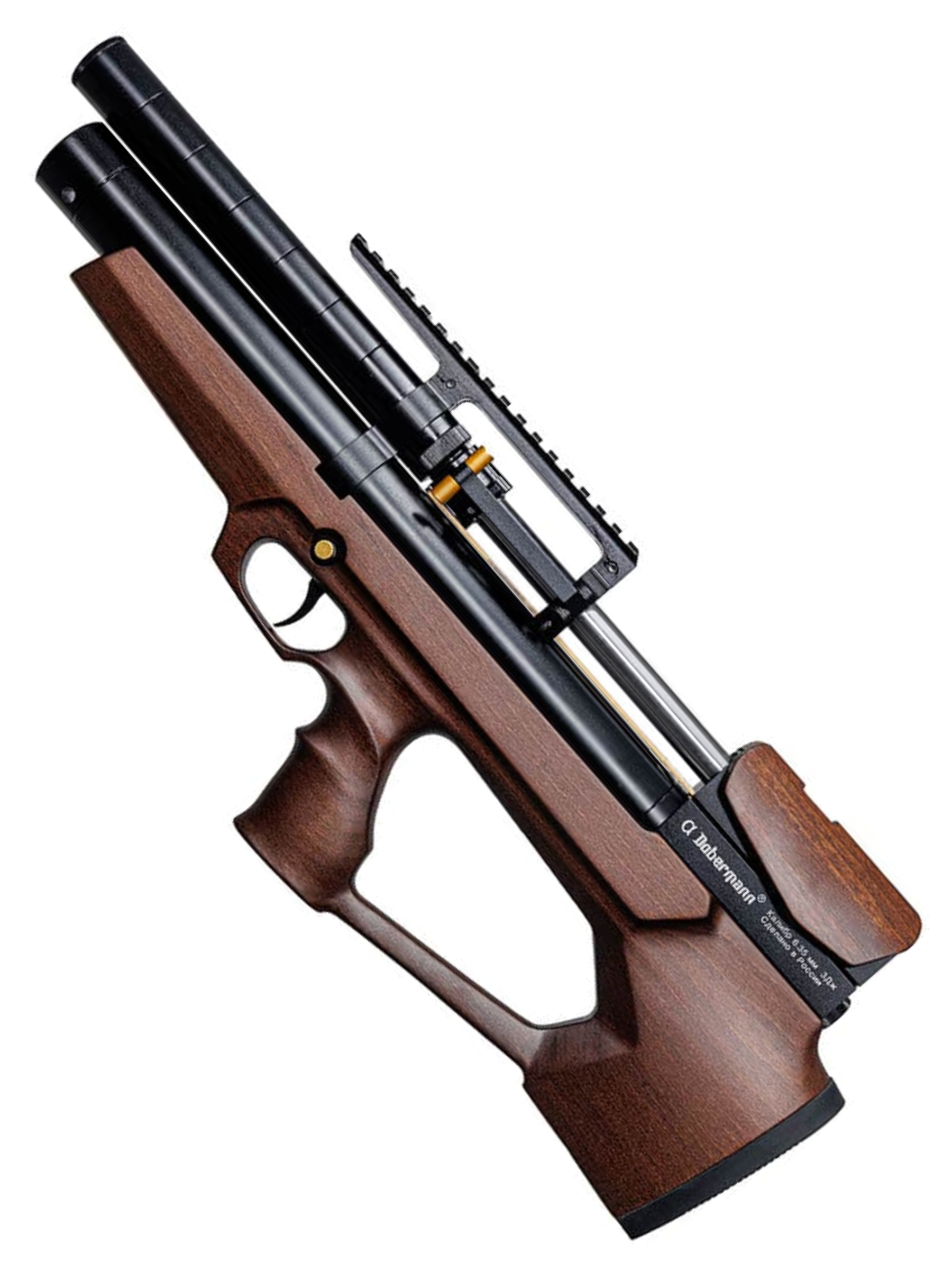 Пневматическая винтовка Dobermann Alfa Булл-пап – это оригинальная разработка российского производителя для стрельбы и развлечений. Модель относится к РСР-пневматике с передним взводом и отличается нестандартным внешним исполнением. Тип взведения винтовки — передний, компоновка – булл-пап, это делает оружие очень компактным.