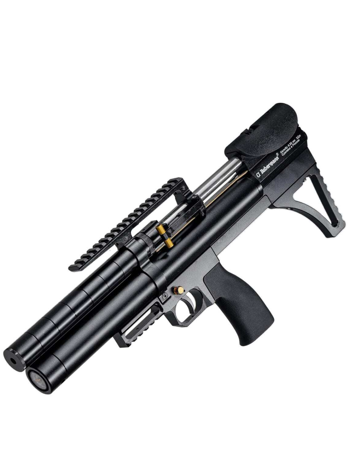 Пневматическая винтовка Dobermann Alfa Булл-пап – это оригинальная разработка российского производителя для стрельбы и развлечений. Модель относится к РСР-пневматике с передним взводом и отличается нестандартным внешним исполнением. Тип взведения винтовки — передний, компоновка – булл-пап, это делает оружие очень компактным.