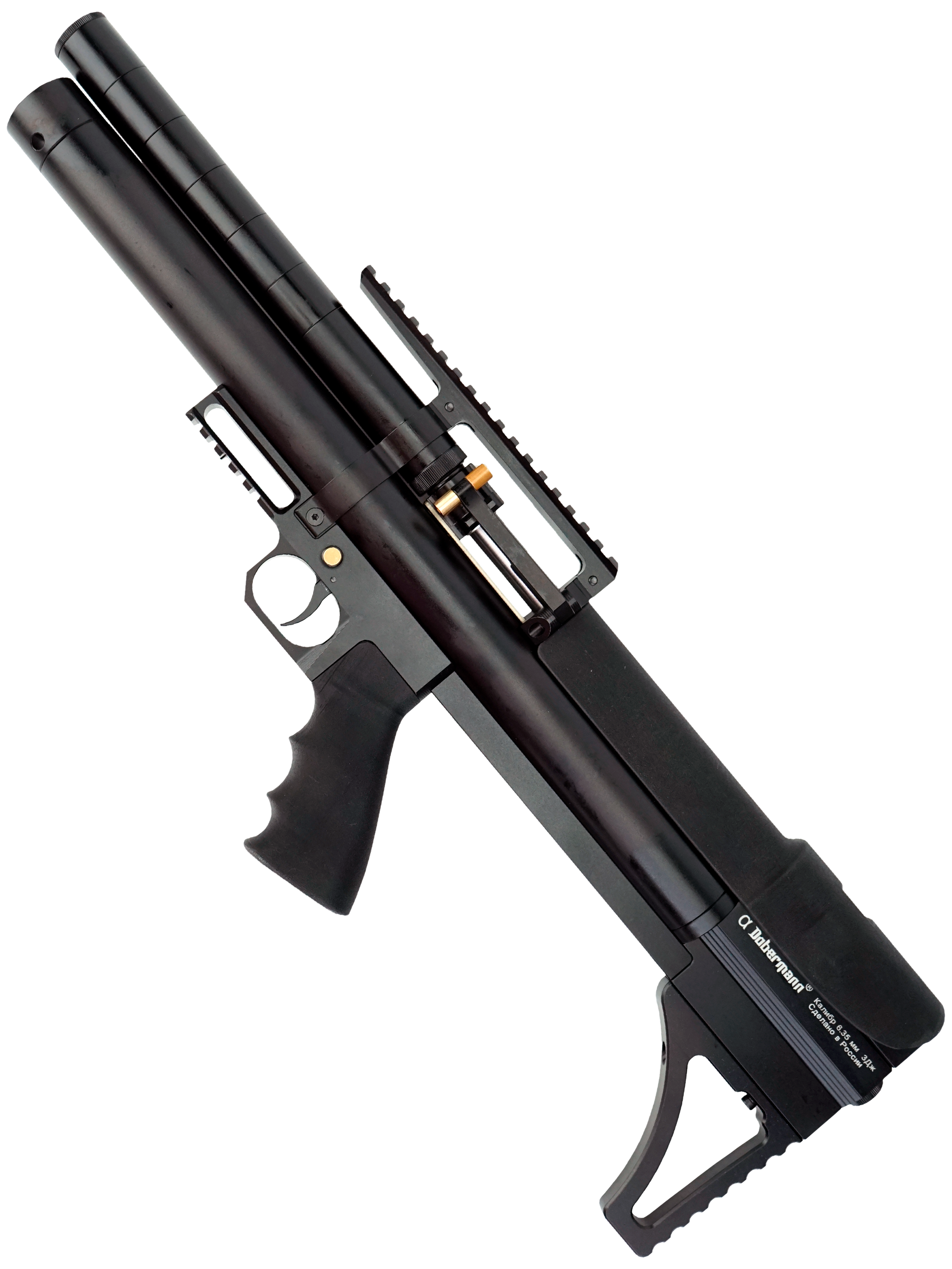 Пневматическая винтовка Dobermann Alfa Булл-пап – это оригинальная разработка российского производителя для стрельбы и развлечений. Модель относится к РСР-пневматике с передним взводом и отличается нестандартным внешним исполнением. Тип взведения винтовки — передний, компоновка – булл-пап, это делает оружие очень компактным.
