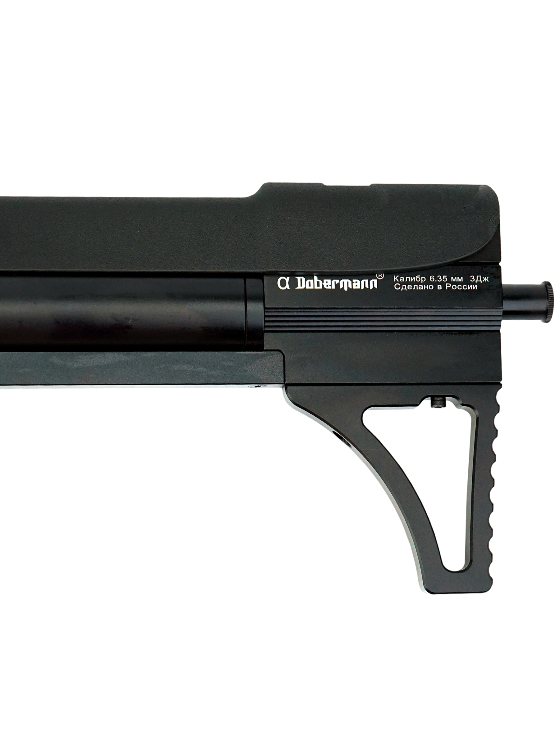 Пневматическая винтовка Dobermann Alfa Булл-пап – это оригинальная разработка российского производителя для стрельбы и развлечений. Модель относится к РСР-пневматике с передним взводом и отличается нестандартным внешним исполнением. Тип взведения винтовки — передний, компоновка – булл-пап, это делает оружие очень компактным.