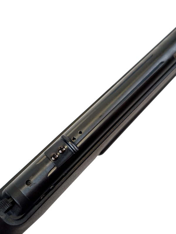 Выше представленная модель Hatsan 70 имеет осмысленное расположение включателя предохранителя - на тыльной стороне цилиндра, еще снизу цевье в винтовке имеется пропил под тяговое устройство поршня, служащее для более комфортного взвода, который, выполняется, кстати, уже всем привычным классическим способом. Также винтовка оборудована регулировочными болтами, которые помогут настроить движение курка под силу стрелка. Спуск мягок и предсказуем.