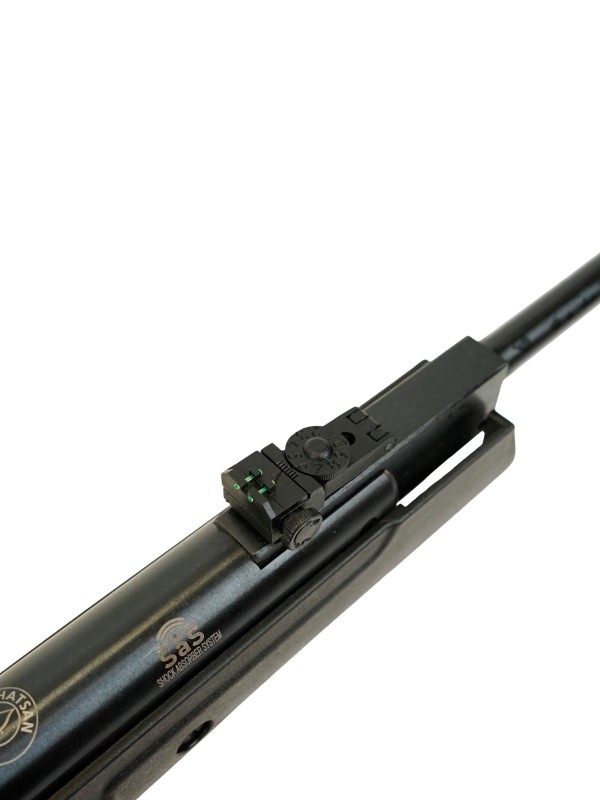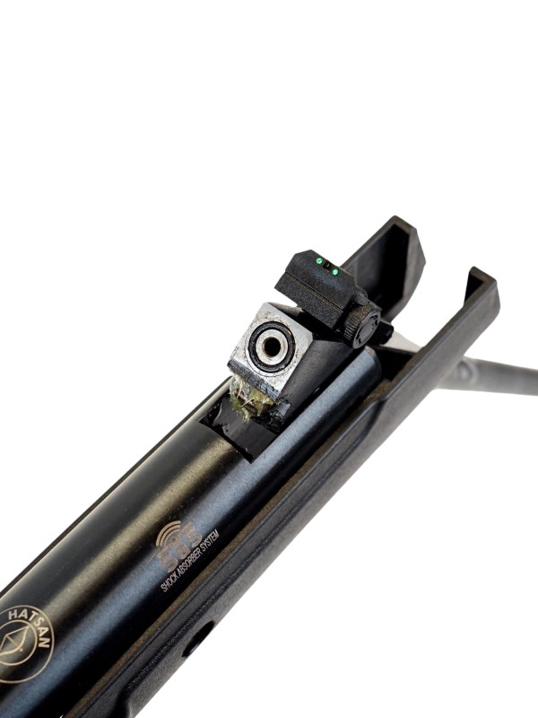 У пневматической винтовки Hatsan 90 TR есть направляющие для оптического прицела, а также гаситель колебаний прицела и прицельная планка с микрометрическими винтами, позволяющими её настраивать вертикально и горизонтально, при этом оптоволокно на мушке и прицельной планке обеспечивает лучшее прицеливание.