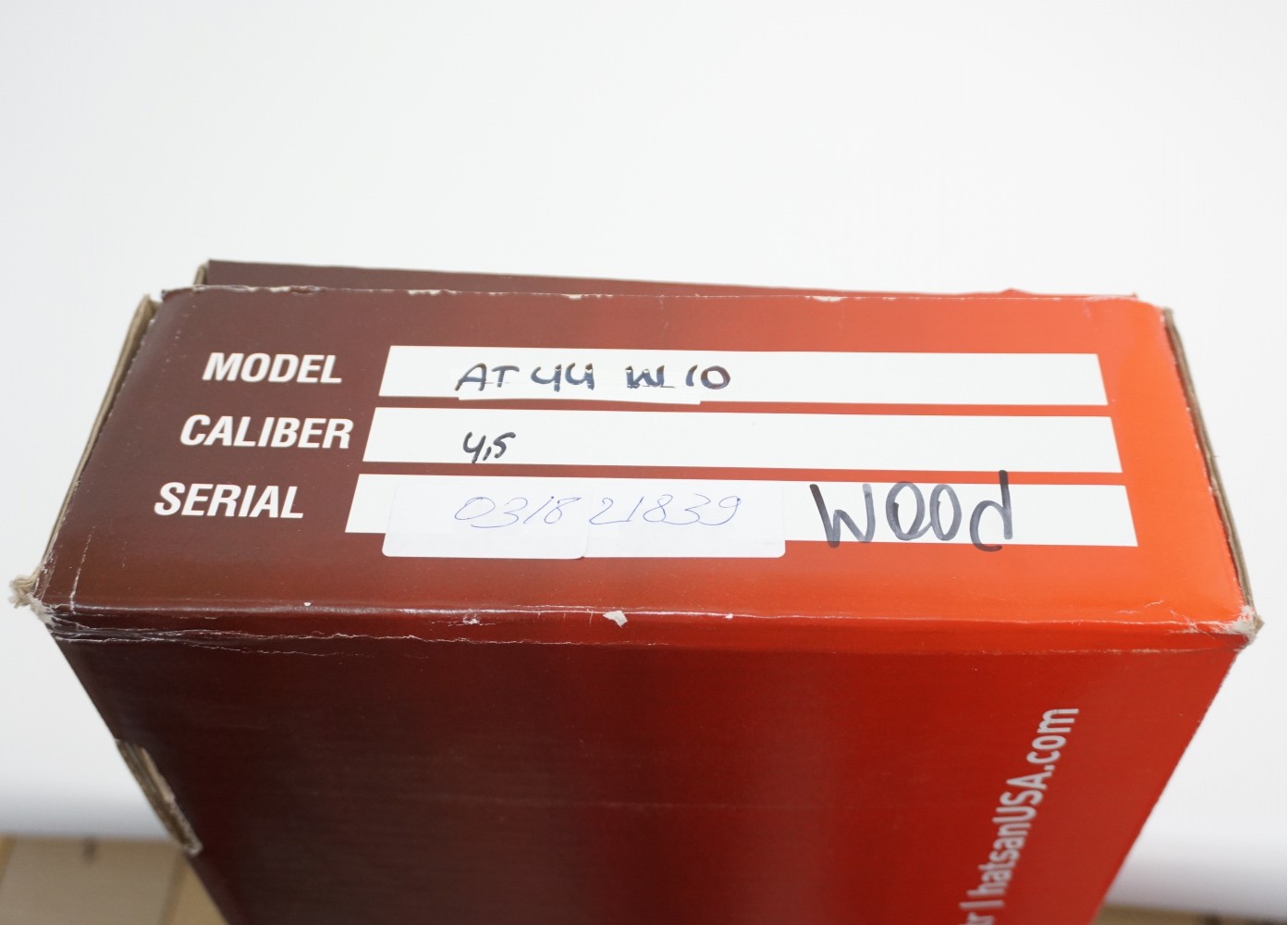 Магазин винтовки Hatsan AT44-10 Wood в виде барабана рассчитан на 10 боеприпасов, роль которых возлагается на свинцовые пули с размером калибра в 4,5 мм. Скорость заряда при выстреле достигает 325 м/сек, что является высоким параметром при учете начальной дульной энергии винтовки в 7,5 Дж. А максимальная мощность может составлять 30 Дж. Взвод оружия производится при помощи бокового рычага при этом спуск регулируется. Эксплуатация изделия безопасна за счет наличия автоматического предохранителя.