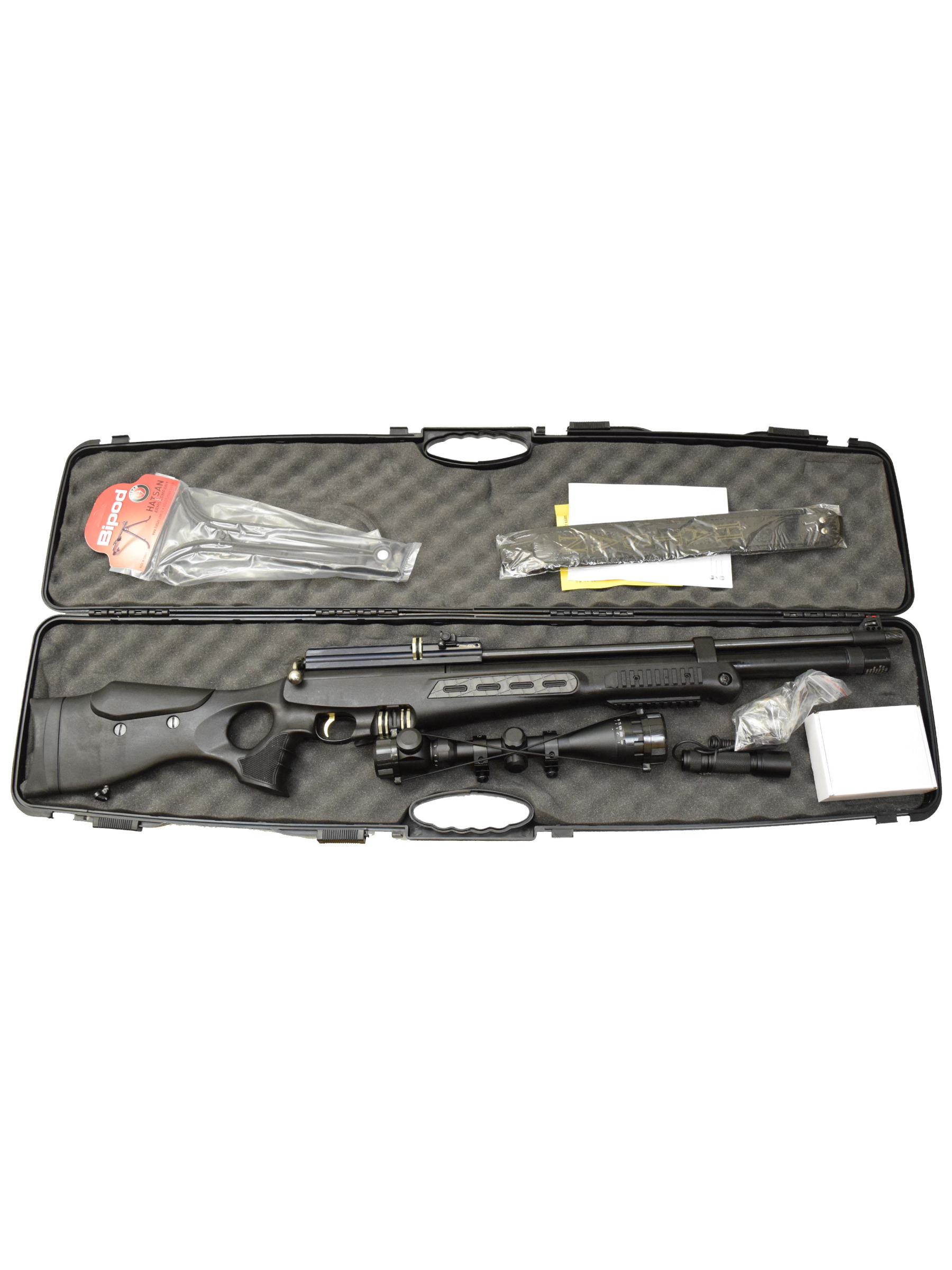 | Комплектация (?): | винтовка, 2 магазина-барабана, уплотнительные прокладки, штуцер (переходник), сошки, прицел Optima 3-12x44 AOE, подствольный фонарик, ремень, инструкция, пластиковый кейс |