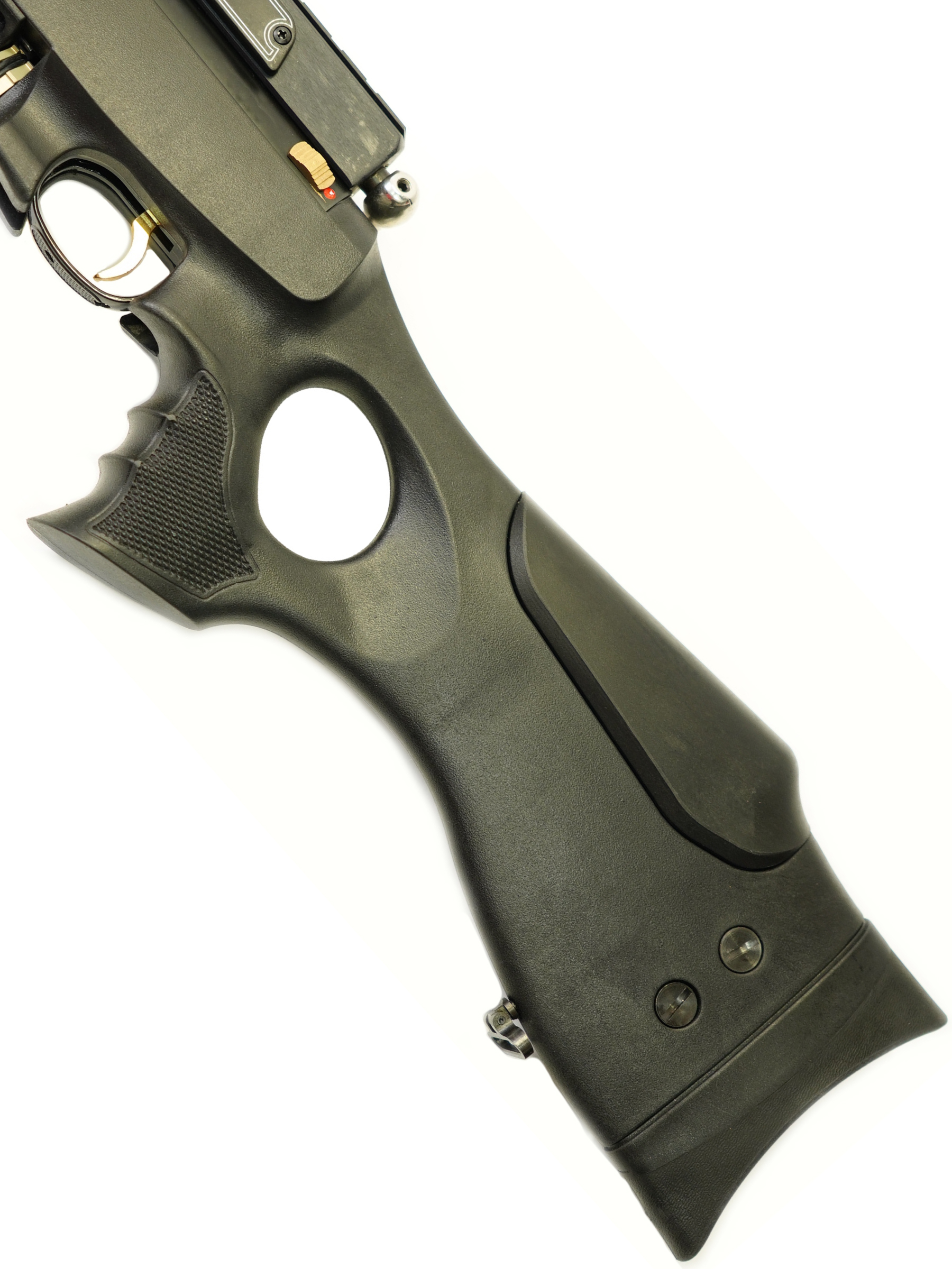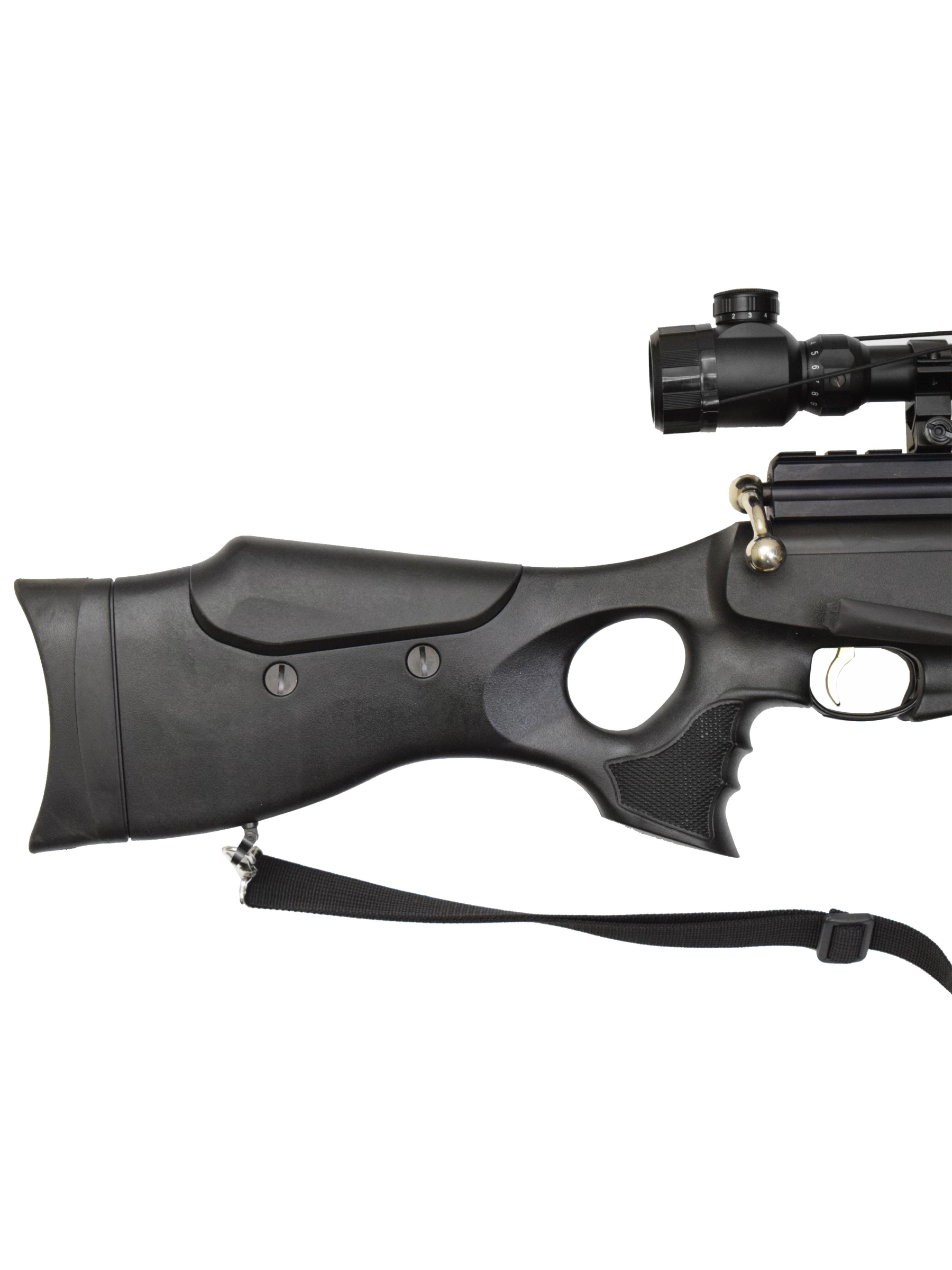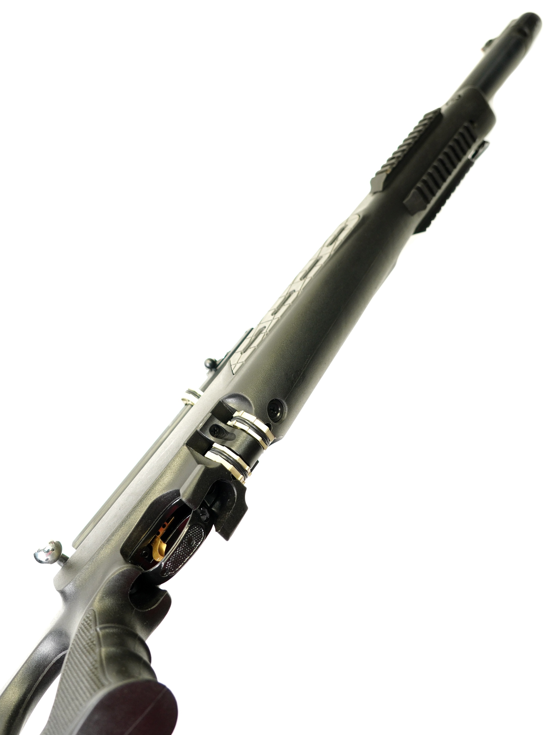 Корпус этой модели выполнен из качественного пластика, рукоять пистолетного типа, имеющая удобный вырез для большого пальца, что позволяет стрелять с обеих рук. За счет использования регулируемых щек и затыльника каждый пользователь сможет настроить винтовку под свои анатомические особенности, повышая тем самым точность и комфорт стрельбы.