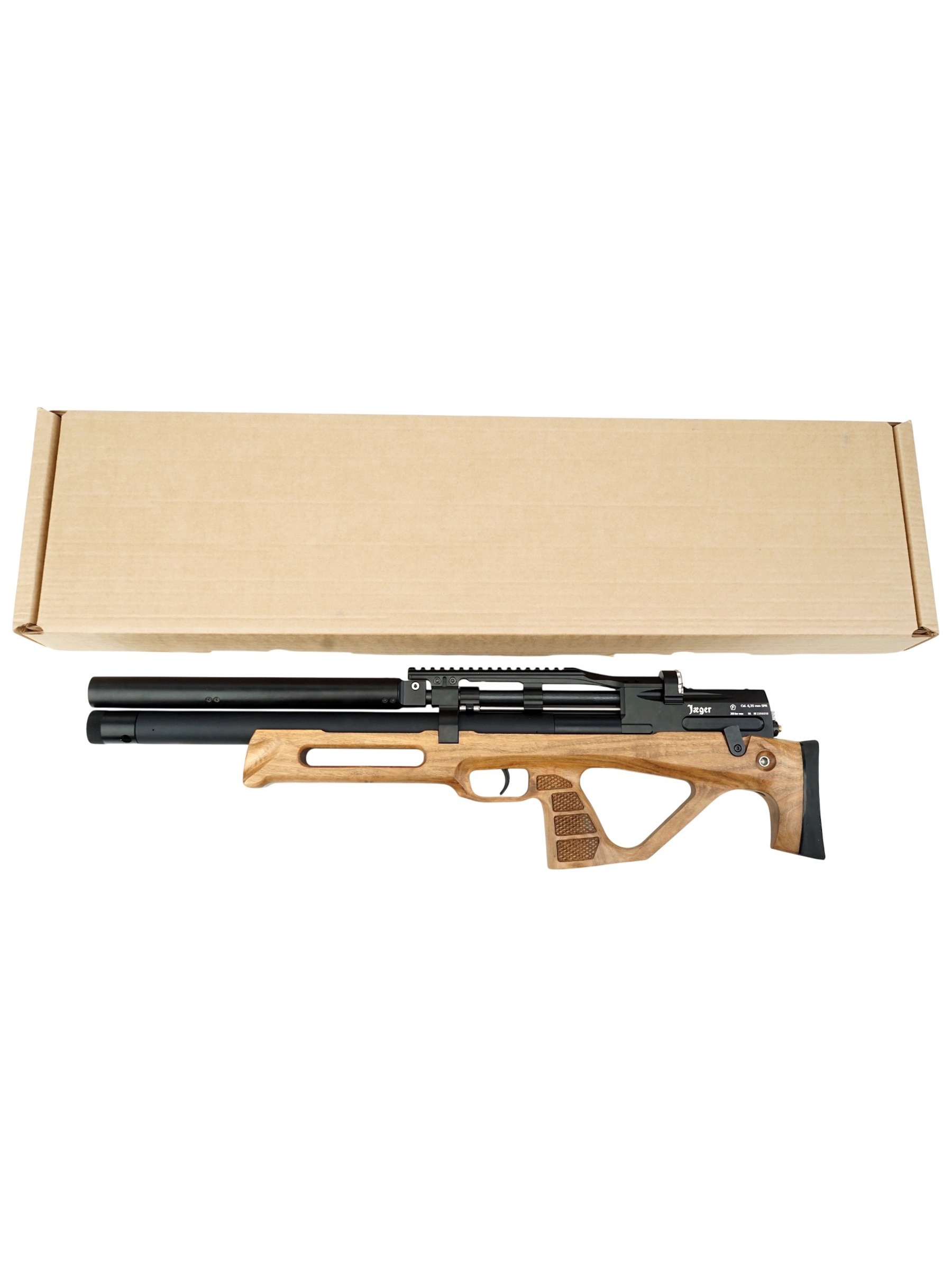 Весит винтовка Jaeger SPR Булл-пап 4,1 кг, ее длина 88 см. Изделие поставляется с саундмодератором, штуцером для заправки, документами и магазином, упаковано в картонную коробку.