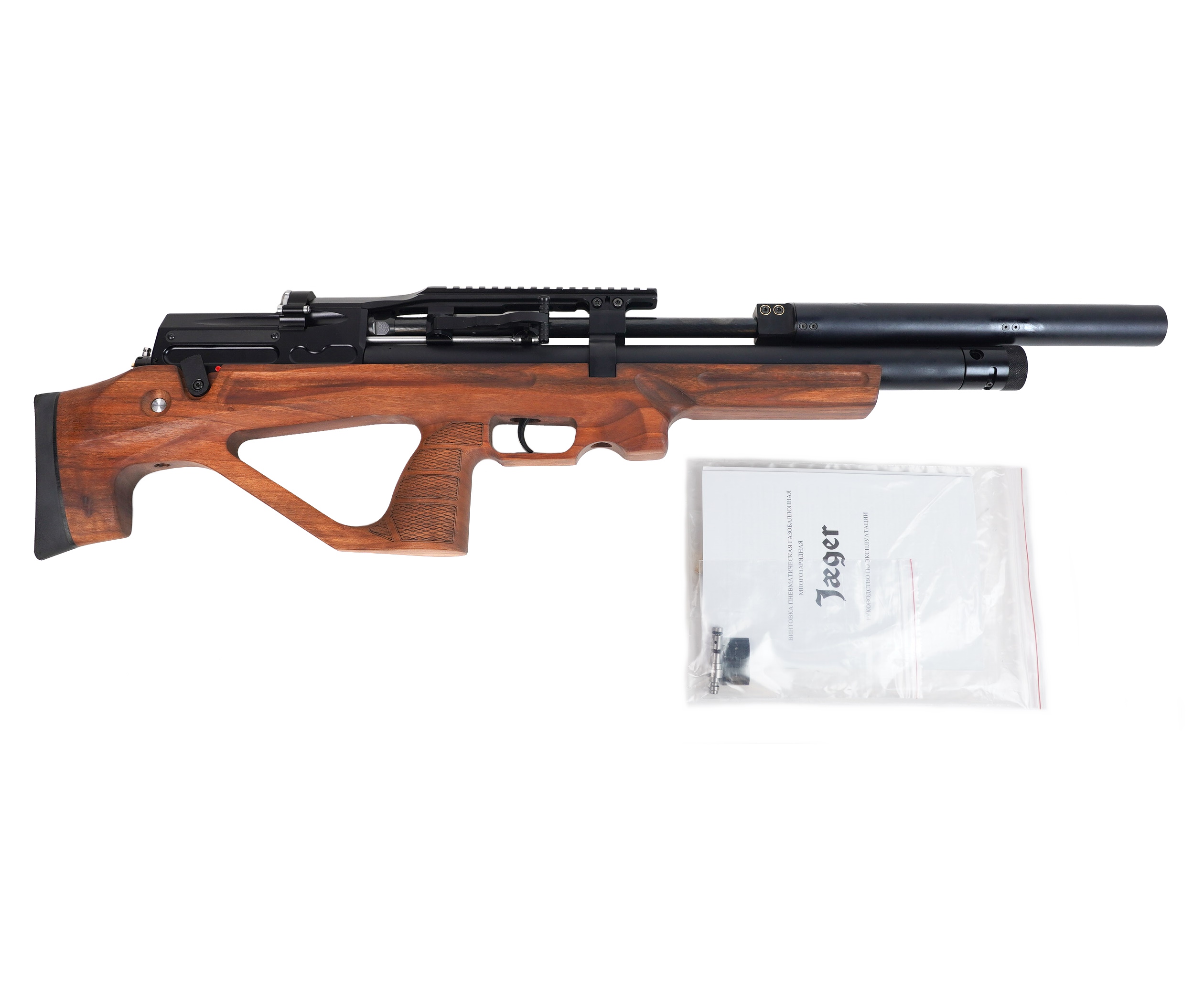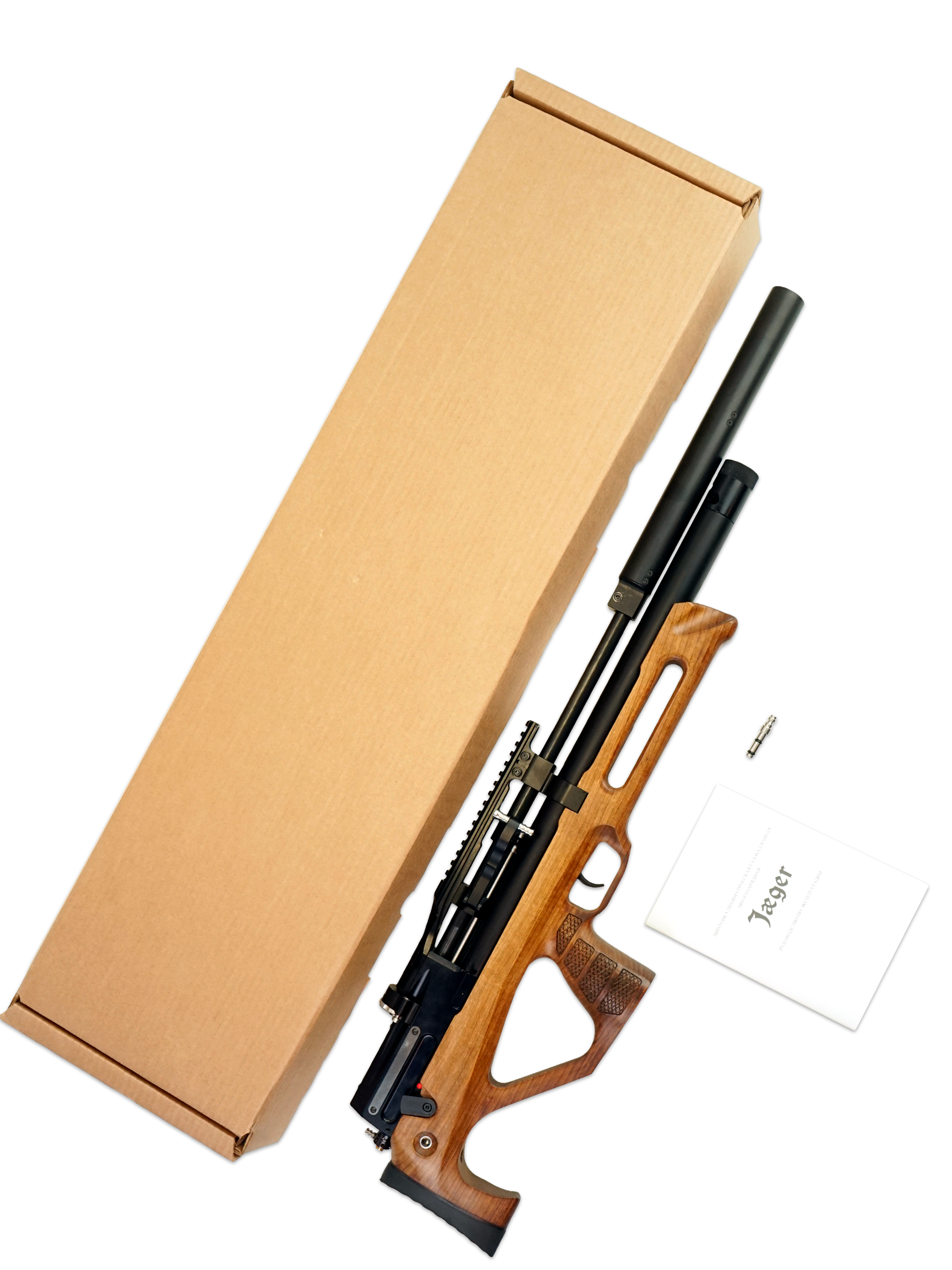 Весит винтовка Jaeger SPR Булл-пап 4,1 кг, ее длина 91 см. Изделие поставляется с саундмодератором, штуцером для заправки, документами и магазином, упаковано в картонную коробку.