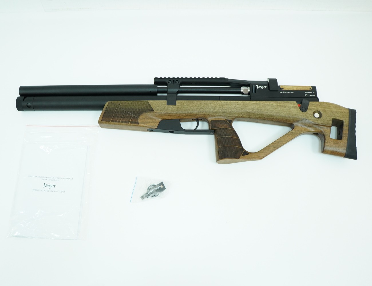 Весит винтовка Jaeger SPR Булл-пап 3,2 кг, ее длина 76,5 см. Изделие поставляется со штуцером для заправки, документами и магазином, упаковано в картонную коробку.