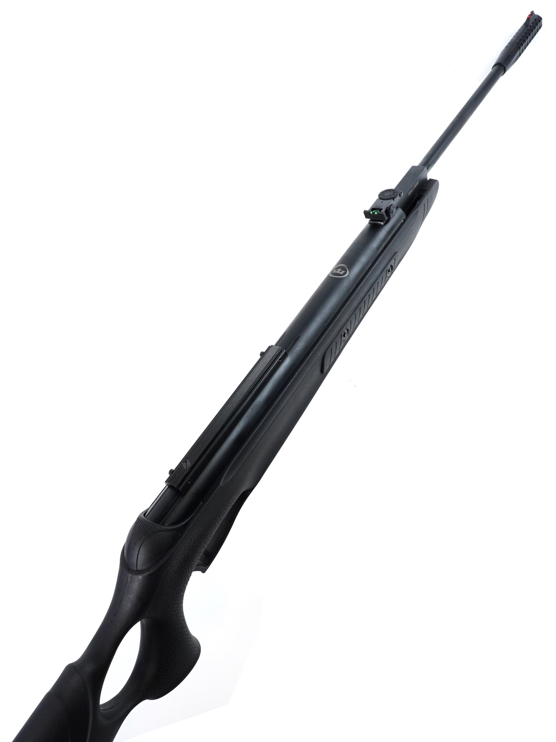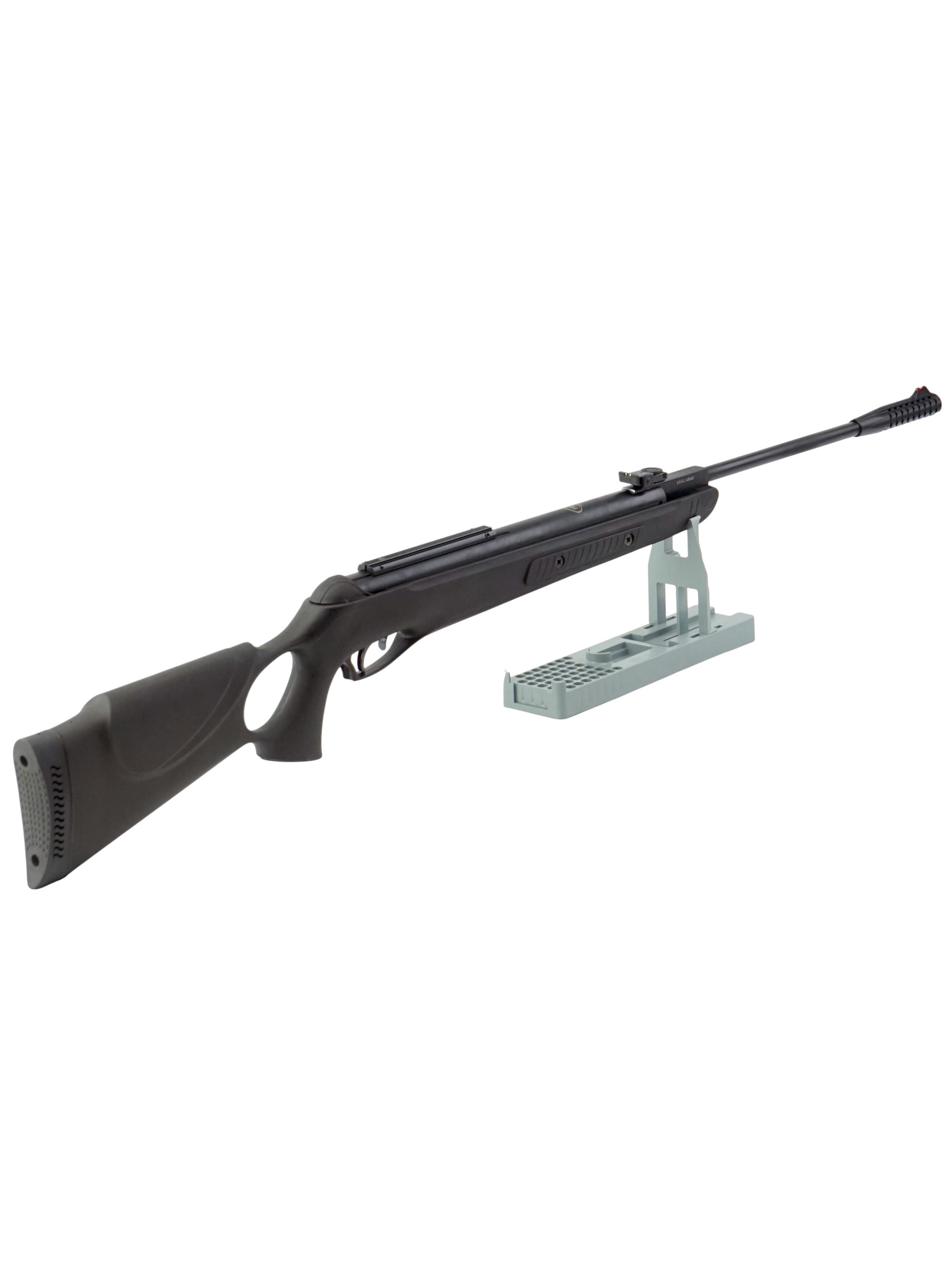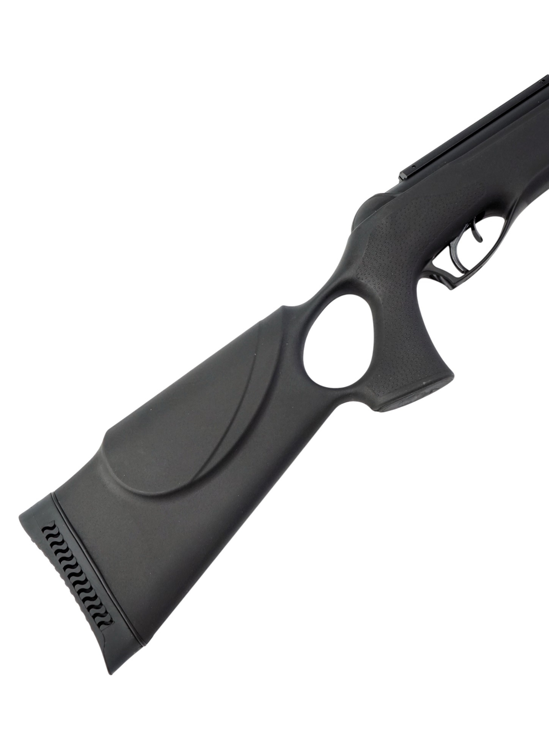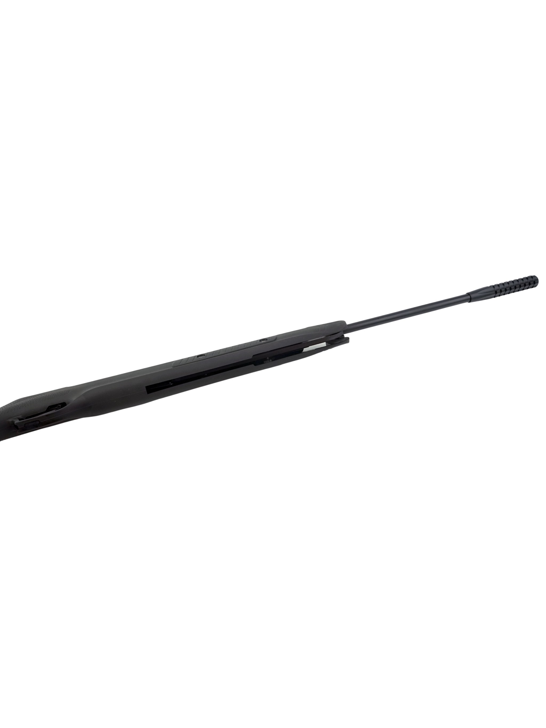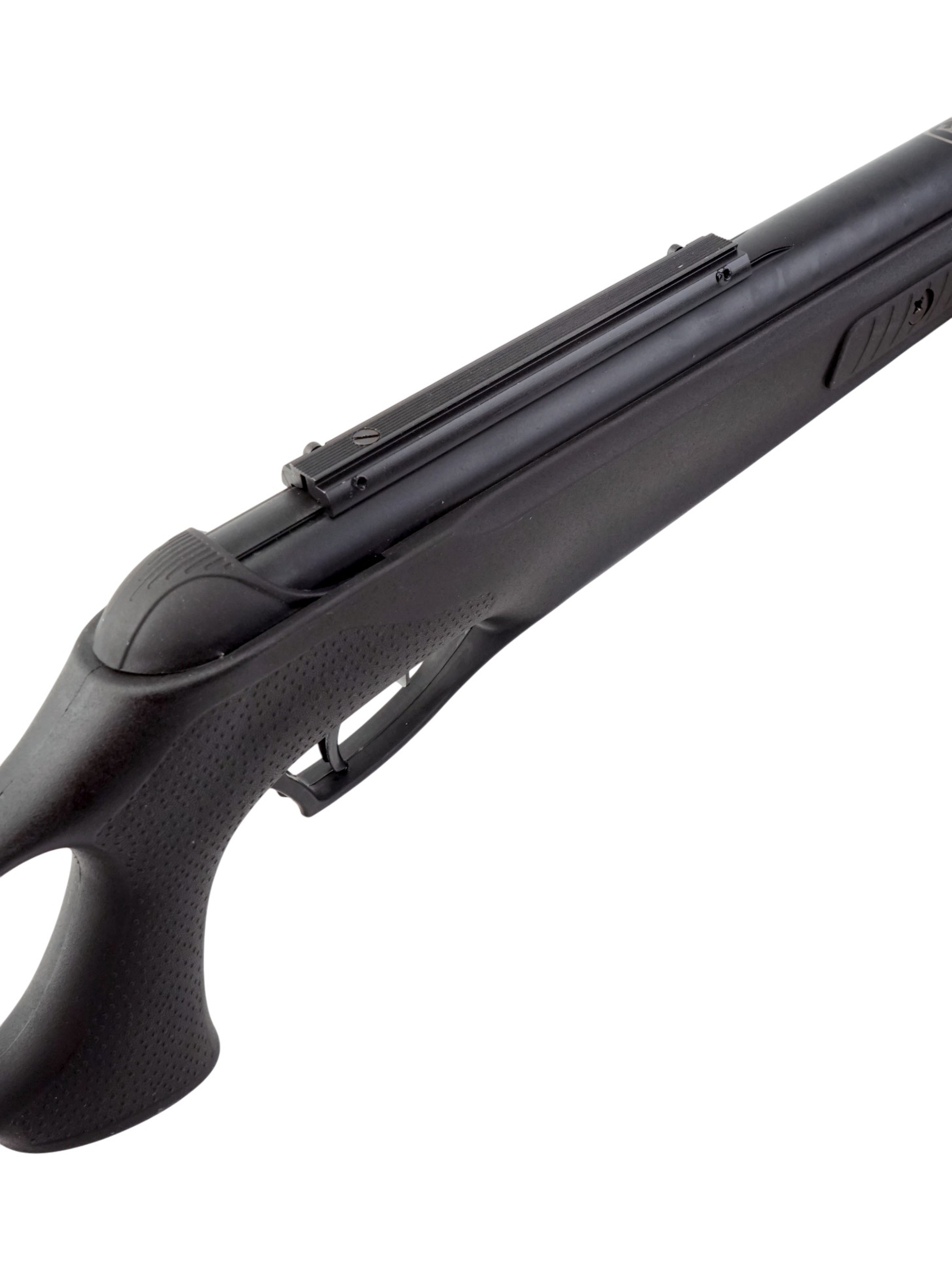 Винтовка выполнена в классической компоновке - длина модели составляет 123 см, при этом масса не превышает 3.5 кг. В конкретном исполнении пневматика оснащается ложей из оружейного пластика черного цвета - полимер стойко выдерживает эксплуатацию в суровых условиях. Удобству удержания способствует приклад ортопедической формы с амортизирующим тыльником из каучука.