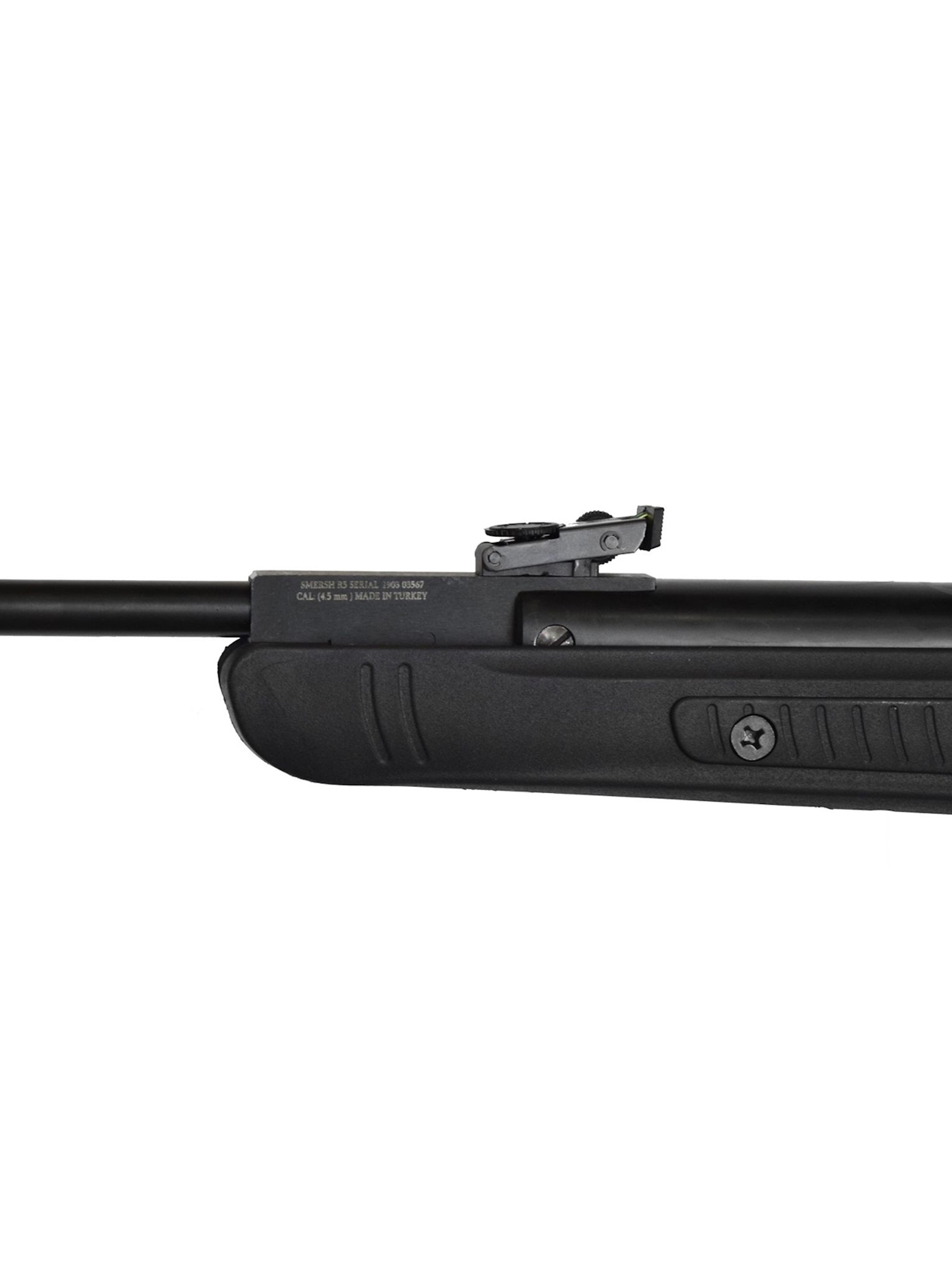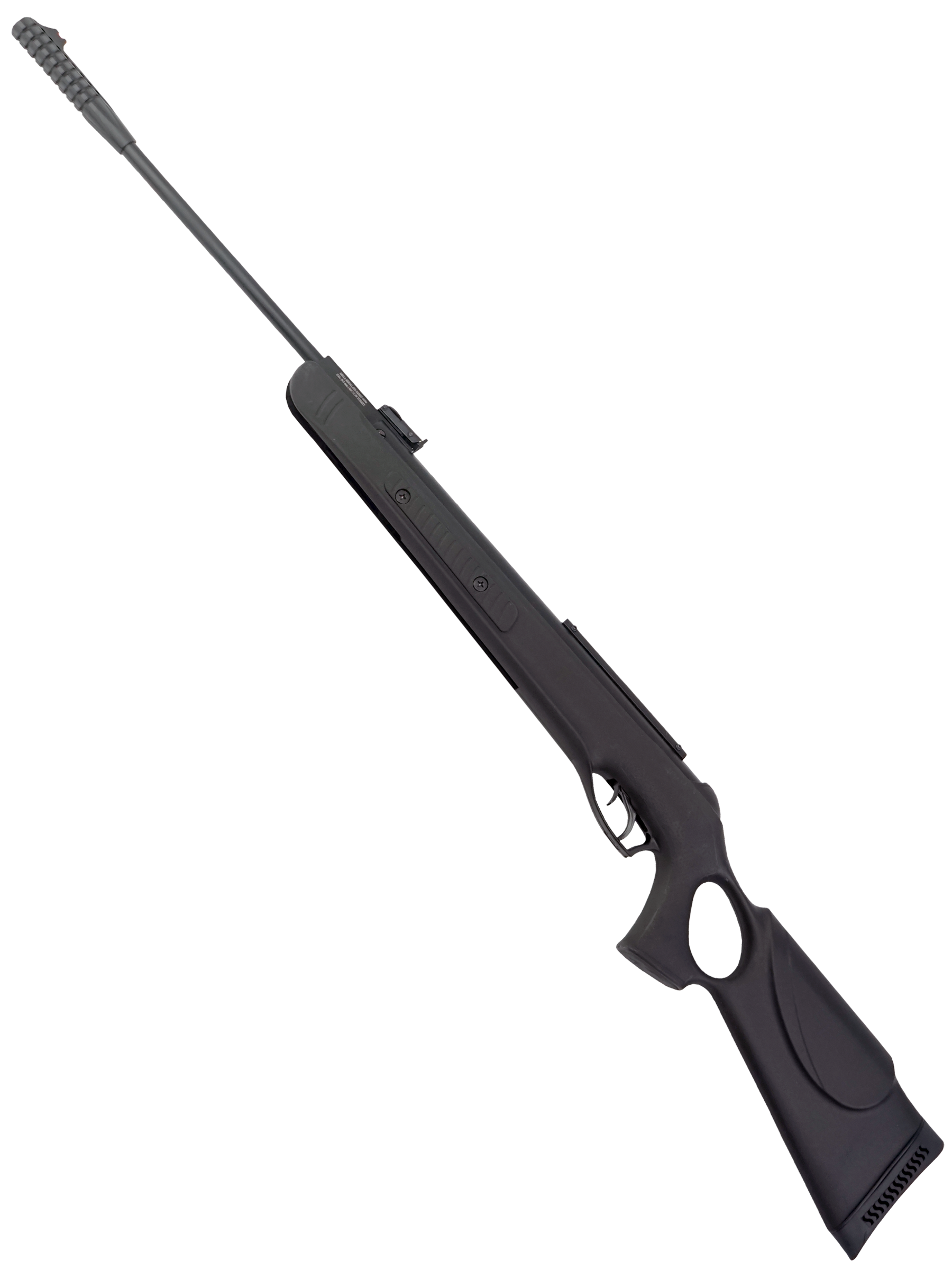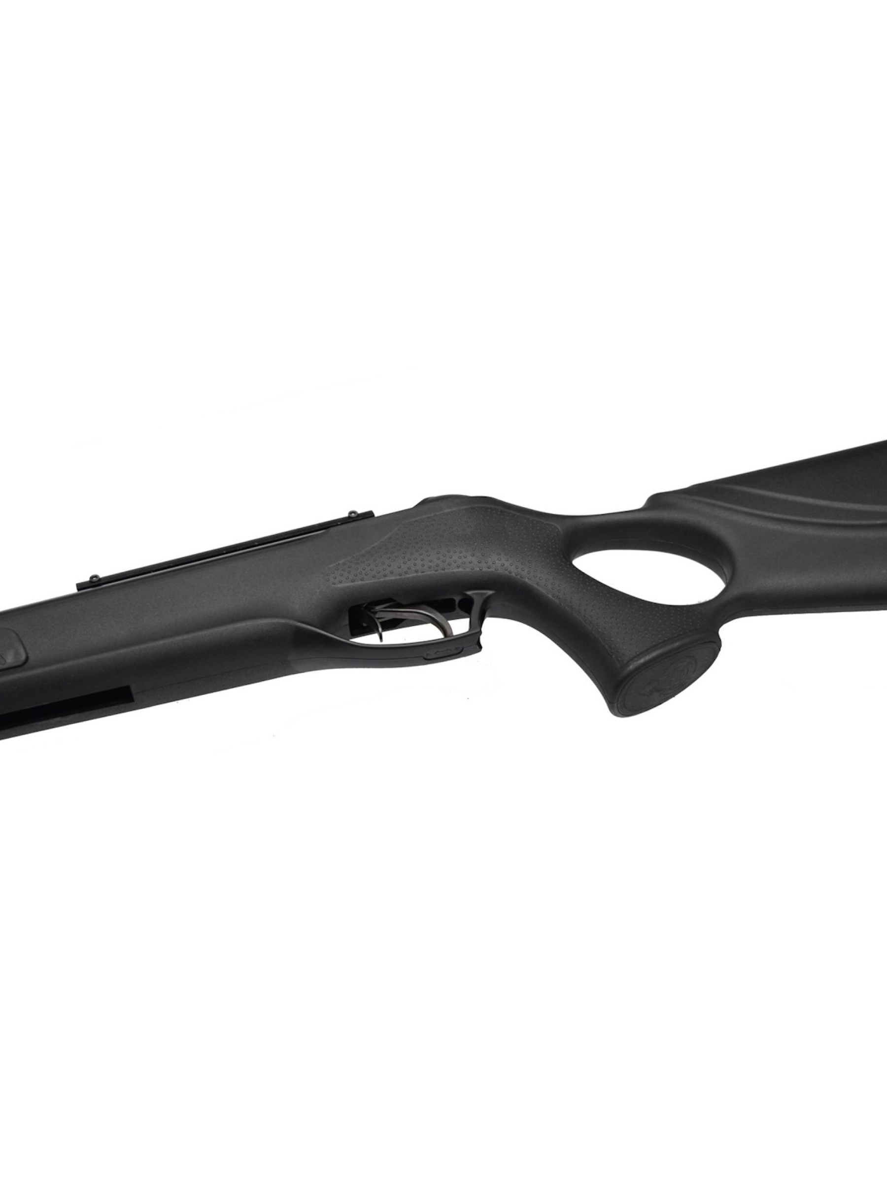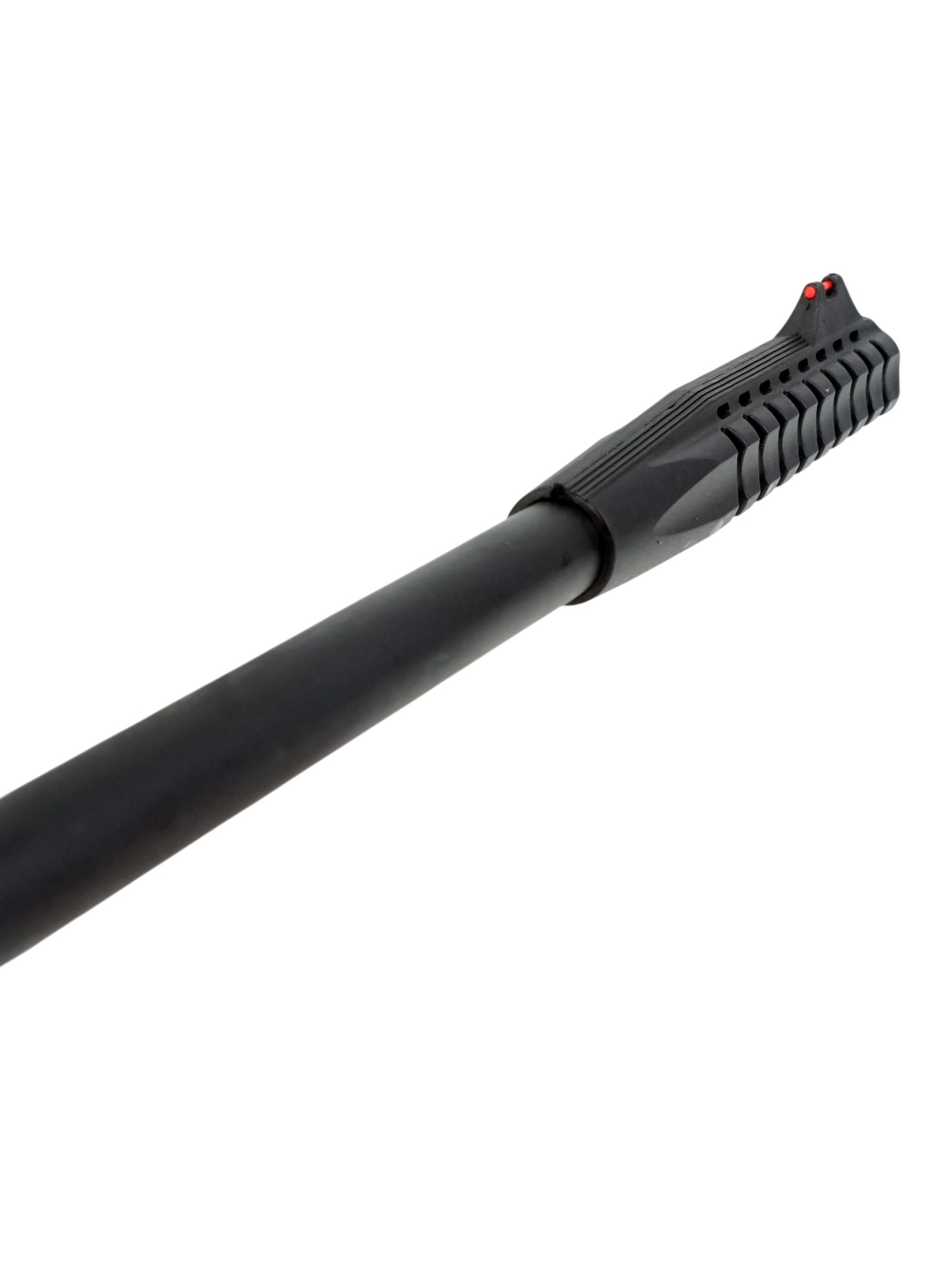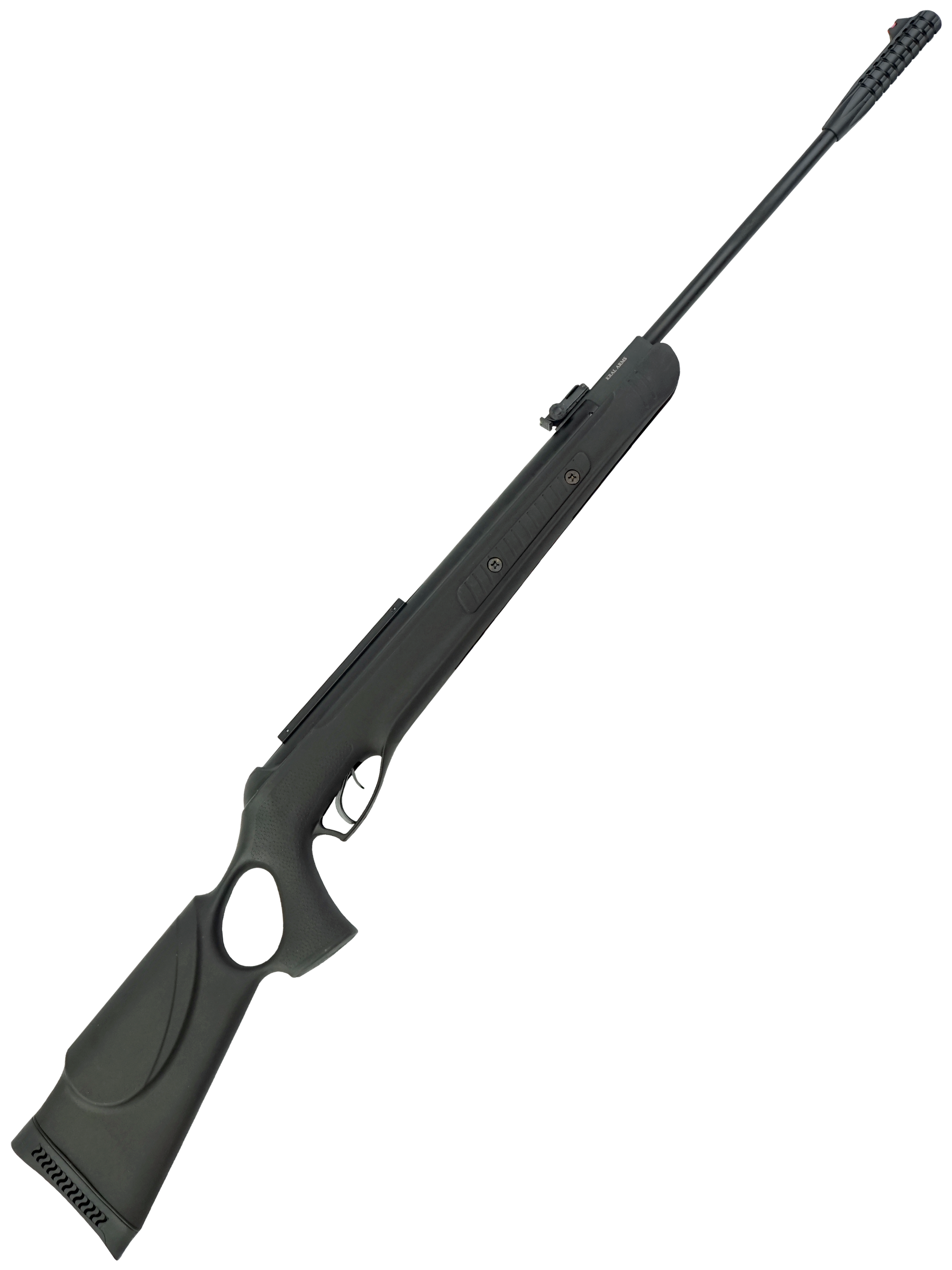 Винтовка выполнена в классической компоновке - длина модели составляет 123 см, при этом масса не превышает 3.5 кг. В конкретном исполнении пневматика оснащается ложей из оружейного пластика черного цвета - полимер стойко выдерживает эксплуатацию в суровых условиях. Удобству удержания способствует приклад ортопедической формы с амортизирующим тыльником из каучука.