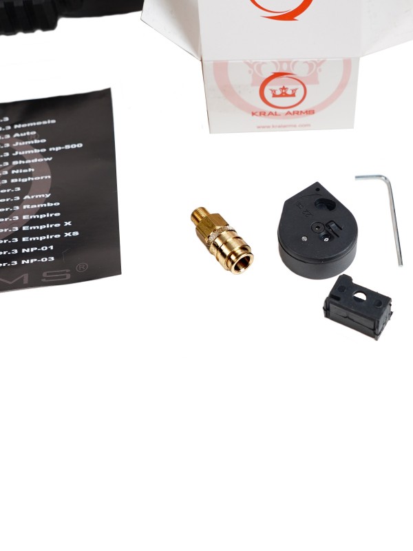 Kral Puncher Empire X предназначена для стрельбы свинцовыми пулями калибра 6.35 мм. В комплекте с винтовкой поставляется 10-зарядный магазин-барабан, который устанавливается в отсек приемника ствольной коробки. Перед каждым выстрелом пневматику необходимо взвести путем оттягивания рукояти затвора, которая расположена на центральной части корпуса с правой стороны.
