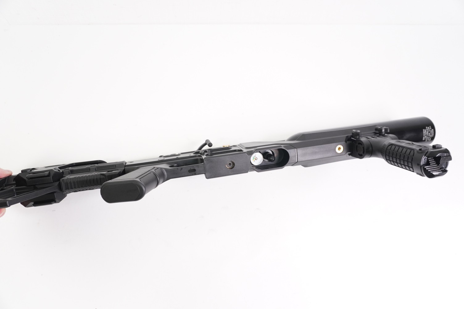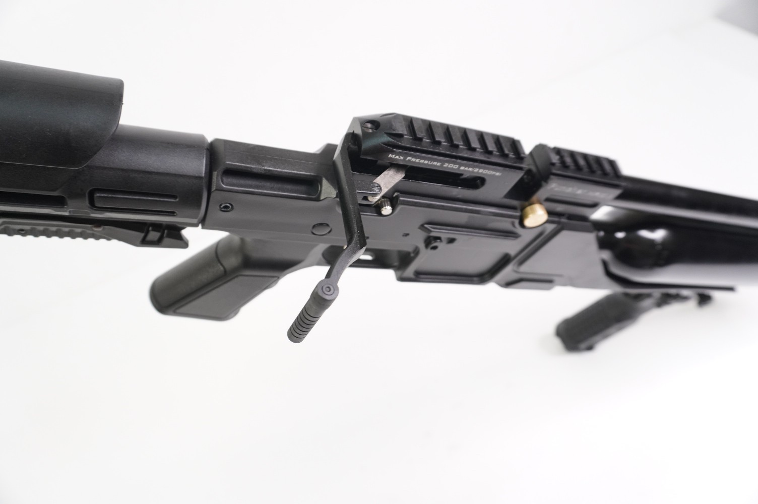 Вес этой винтовки 3,4 кг при максимальной длине 77 см. В комплекте: два магазина, тактические сошки, штуцер для заправки, документы, кейс для переноски.