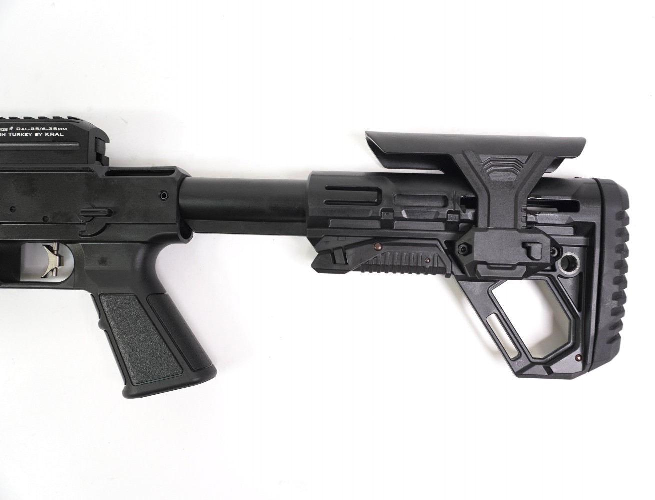 Режим стрельбы здесь одиночный, поэтому после каждого произведенного выстрела необходимо передернуть затвор. Магазин Kral Puncher Jumbo барабанного типа, на 12 боеприпасов, причем модель комплектуется двумя магазинами. Спуск винтовки регулируемый.