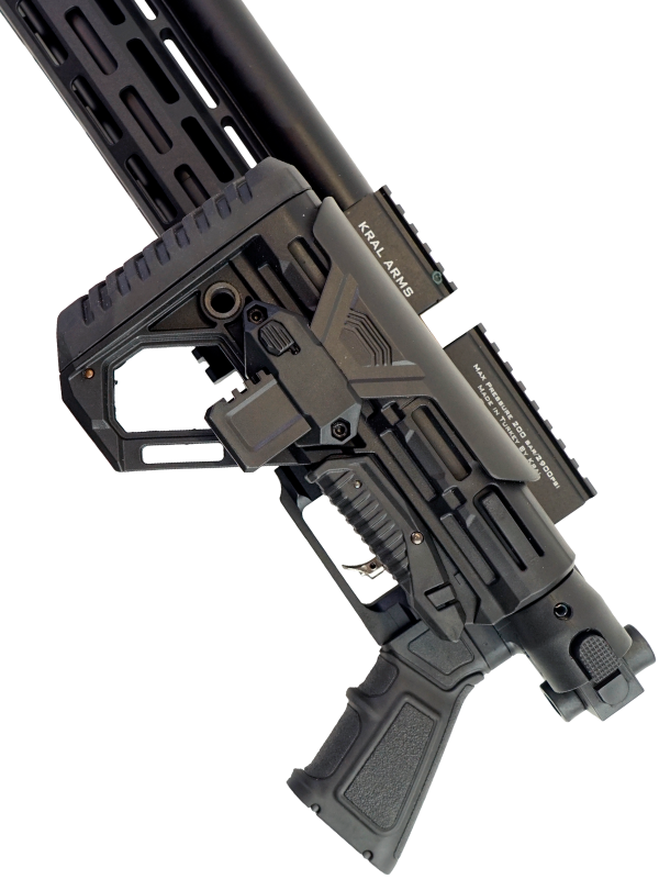 Kral Puncher Maxi Mortal имеет пластиковое ложе. Специальное покрытие корпуса защищает металлические элементы от коррозии. Особенностью данной винтовки является складной приклад.