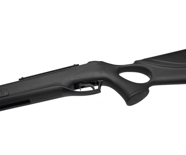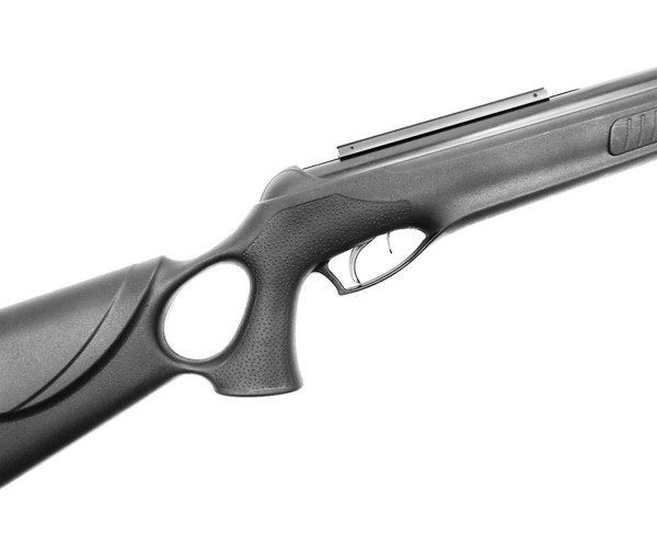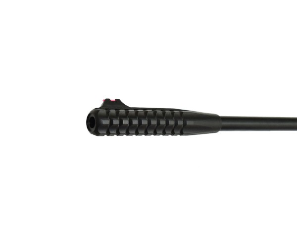 Винтовка выполнена в классической компоновке - длина модели составляет 123 см, при этом масса не превышает 3.5 кг. В конкретном исполнении пневматика оснащается ложей из оружейного пластика черного цвета - полимер стойко выдерживает эксплуатацию в суровых условиях. Удобству удержания способствует приклад ортопедической формы с амортизирующим тыльником из каучука.
