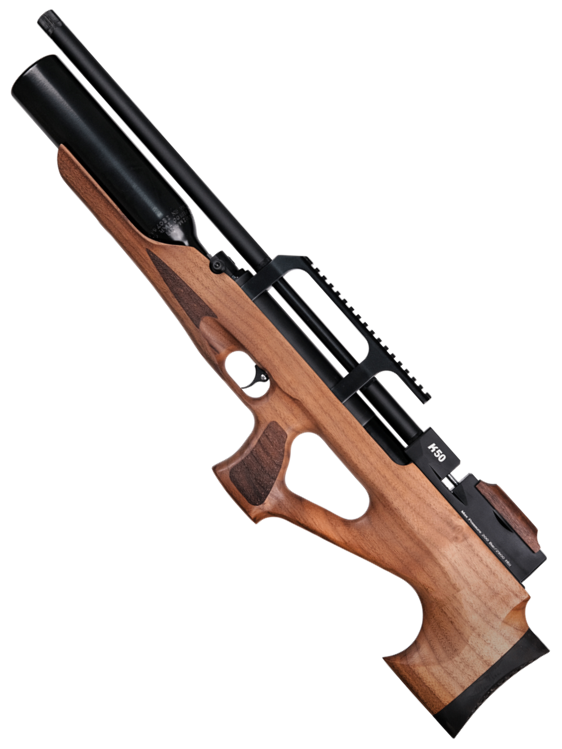 Kuzey K50 работает по принципу PCP — с предварительной накачкой баллона высокого давления объемом 425 см³ и максимумом в 200 бар. Резервуар оснащен манометром для контроля давления, что делает эксплуатацию простой и безопасной. Винтовка оснащена нарезным стволом, способным развивать скорость пули до 300 м/с, а дульная энергия достигает 3 Дж — оптимальный показатель для точных выстрелов.