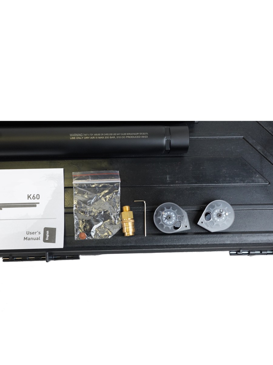 Комплектация (?): | винтовка, магазин-барабан - 2 шт., заправочный штуцер, набор уплотнительных колец, шестигранники, инструкция, кейс |