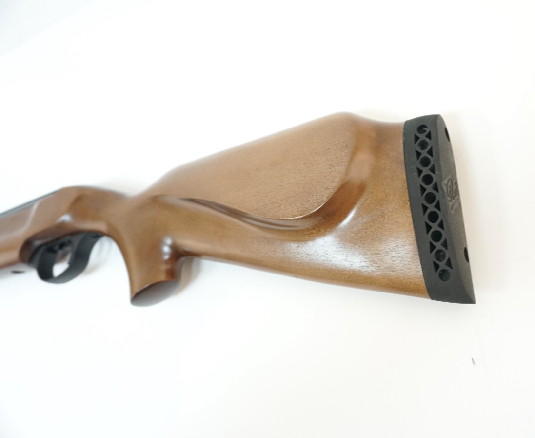 Модель отличается стильным дизайном, приклад получил гребень с левой стороны, что сделало эту винтовку универсальной и удобной для всех стрелков – и левшей, и правшей. Материал ствола – сталь, приклад и ложе выполнены из натуральной древесины березы, и тщательно обработаны. Цвет светло-коричневый.