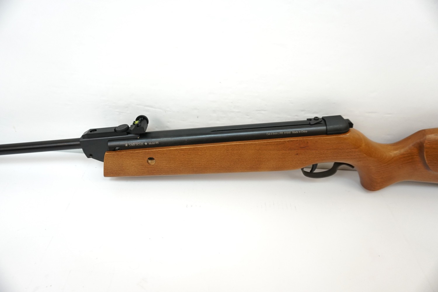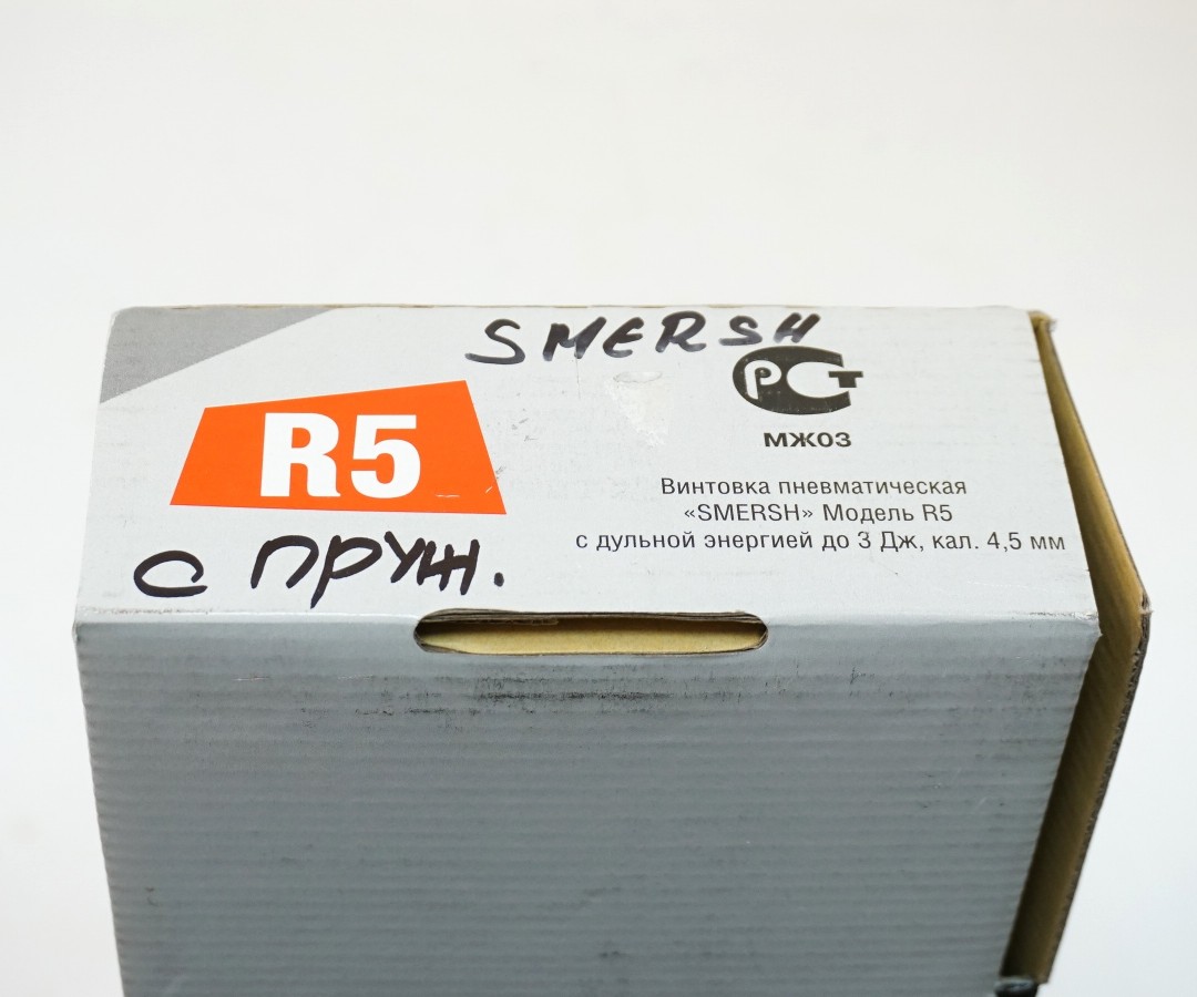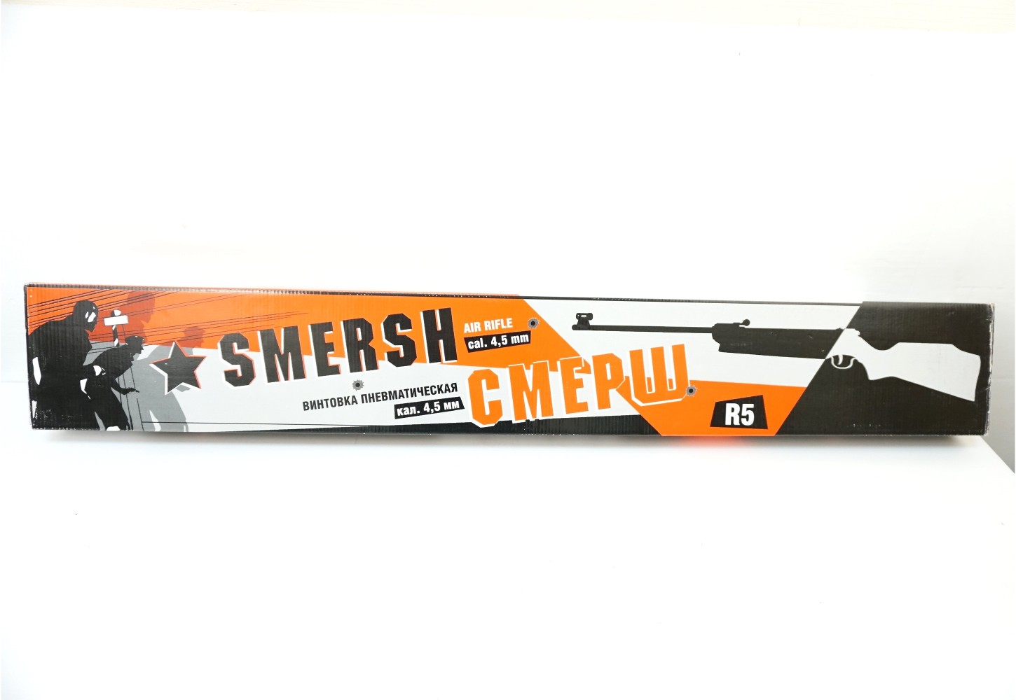 Модель однозарядная, стреляет пулями 4,5 мм. Скорость вылета снаряда из ствола – 112 м/с. Штатная мощность винтовки Smersh R5 – до 3 Дж, после усиления этот показатель может увеличиться в 5-7 раз.