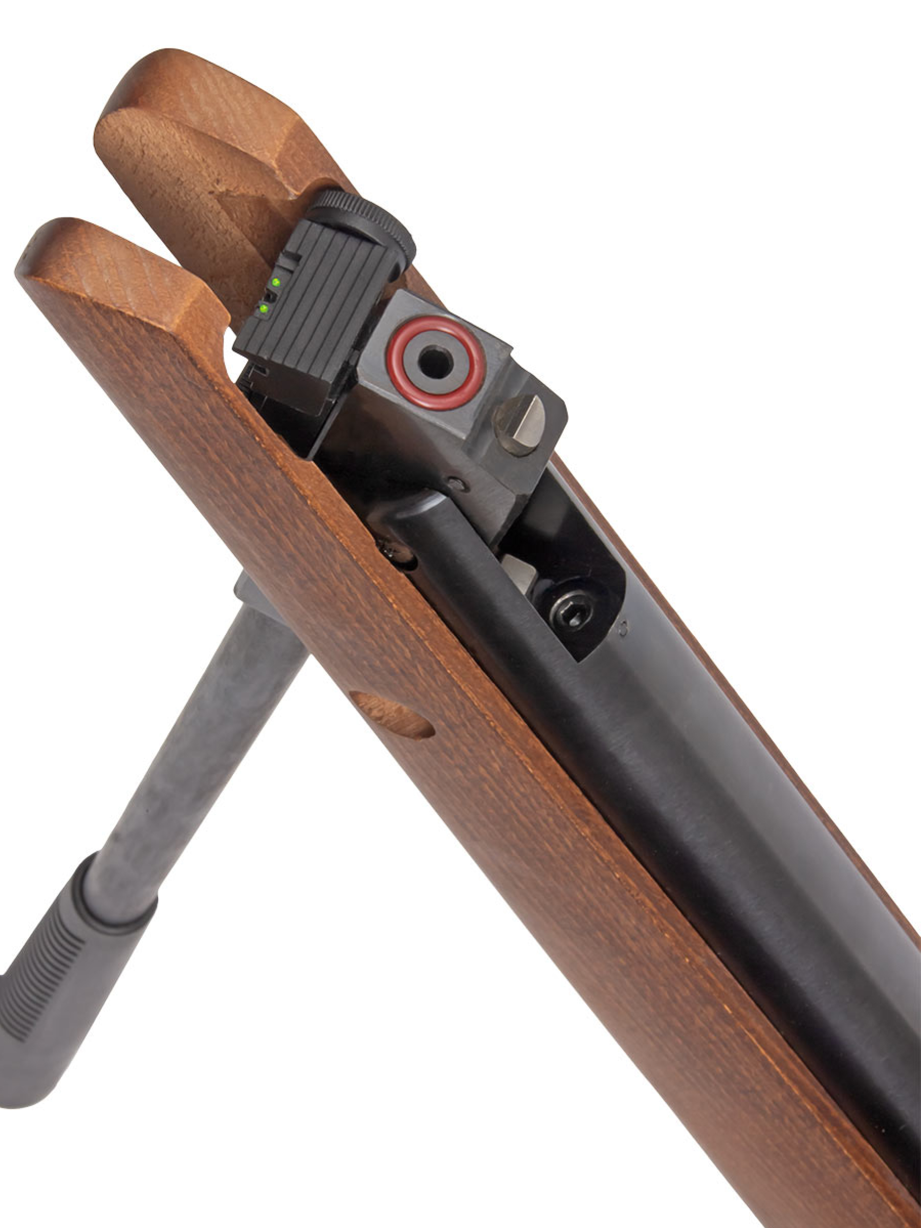 Пневматическая винтовка Stalker имеет открытые прицельные приспособления — неподвижную мушку и регулируемый целик с фибероптическими элементами, улучшающими прицеливание при плохой видимости. С помощью двух барабанчиков ввода поправок целик может регулироваться по горизонтали и вертикали.