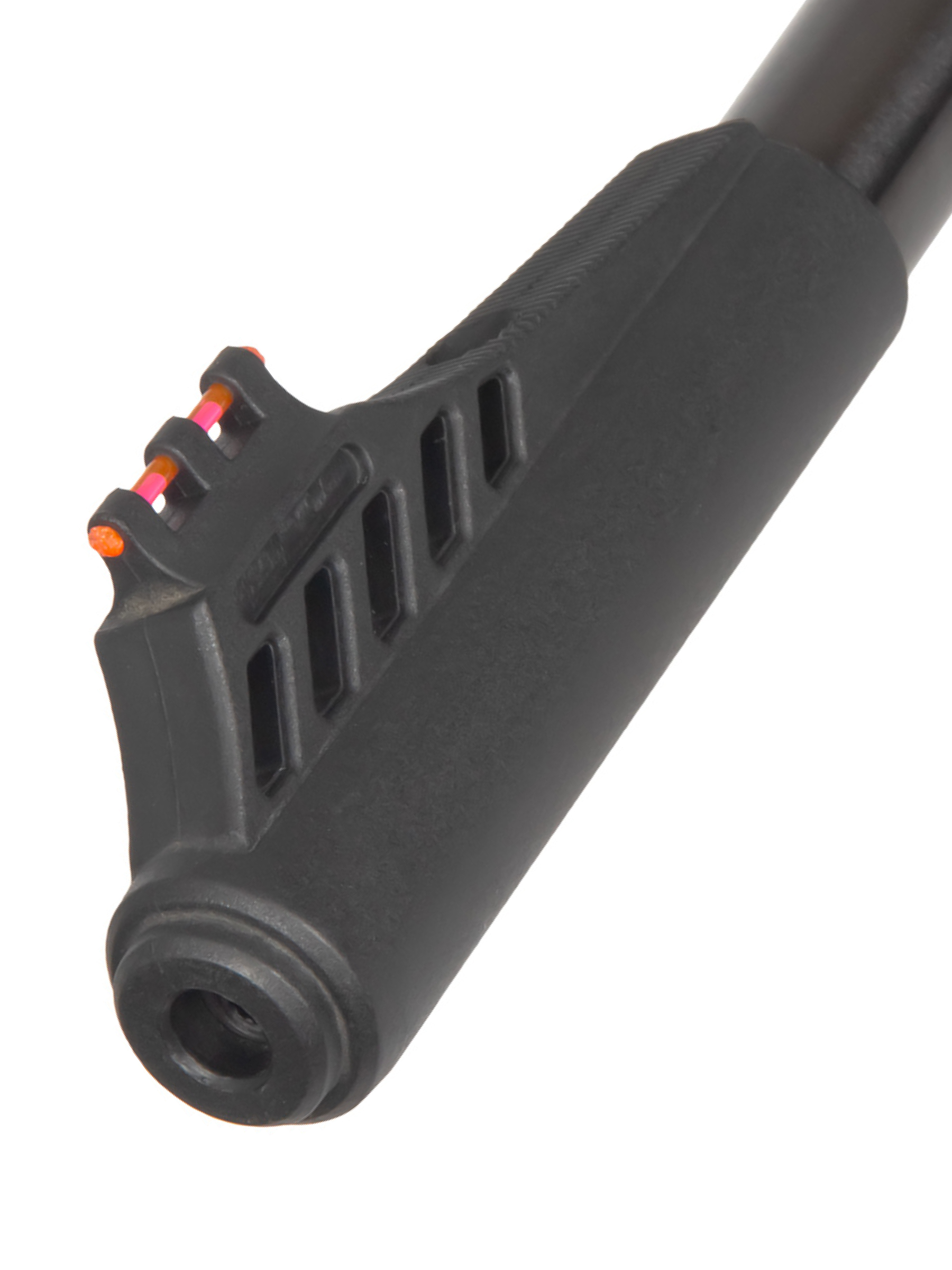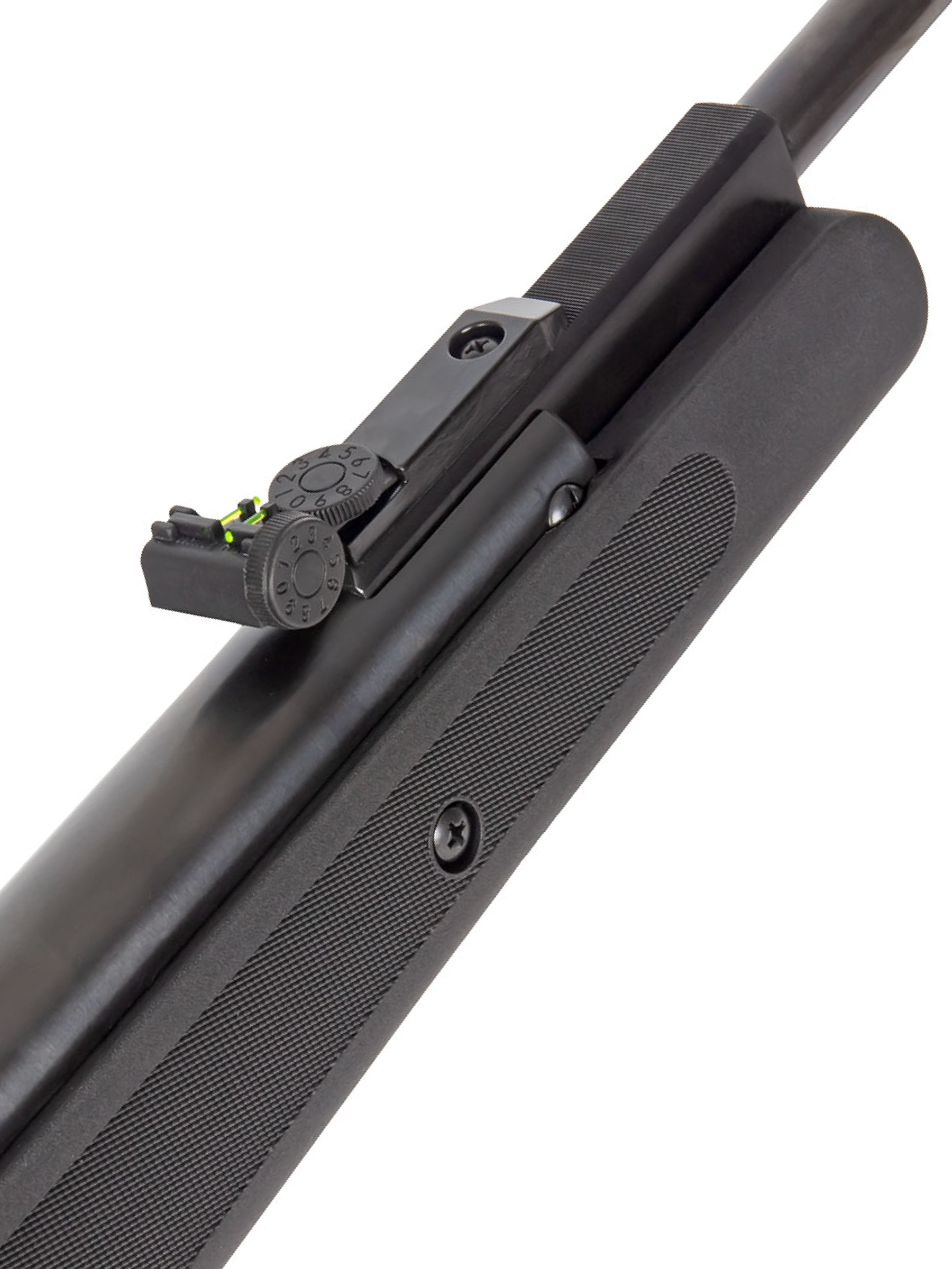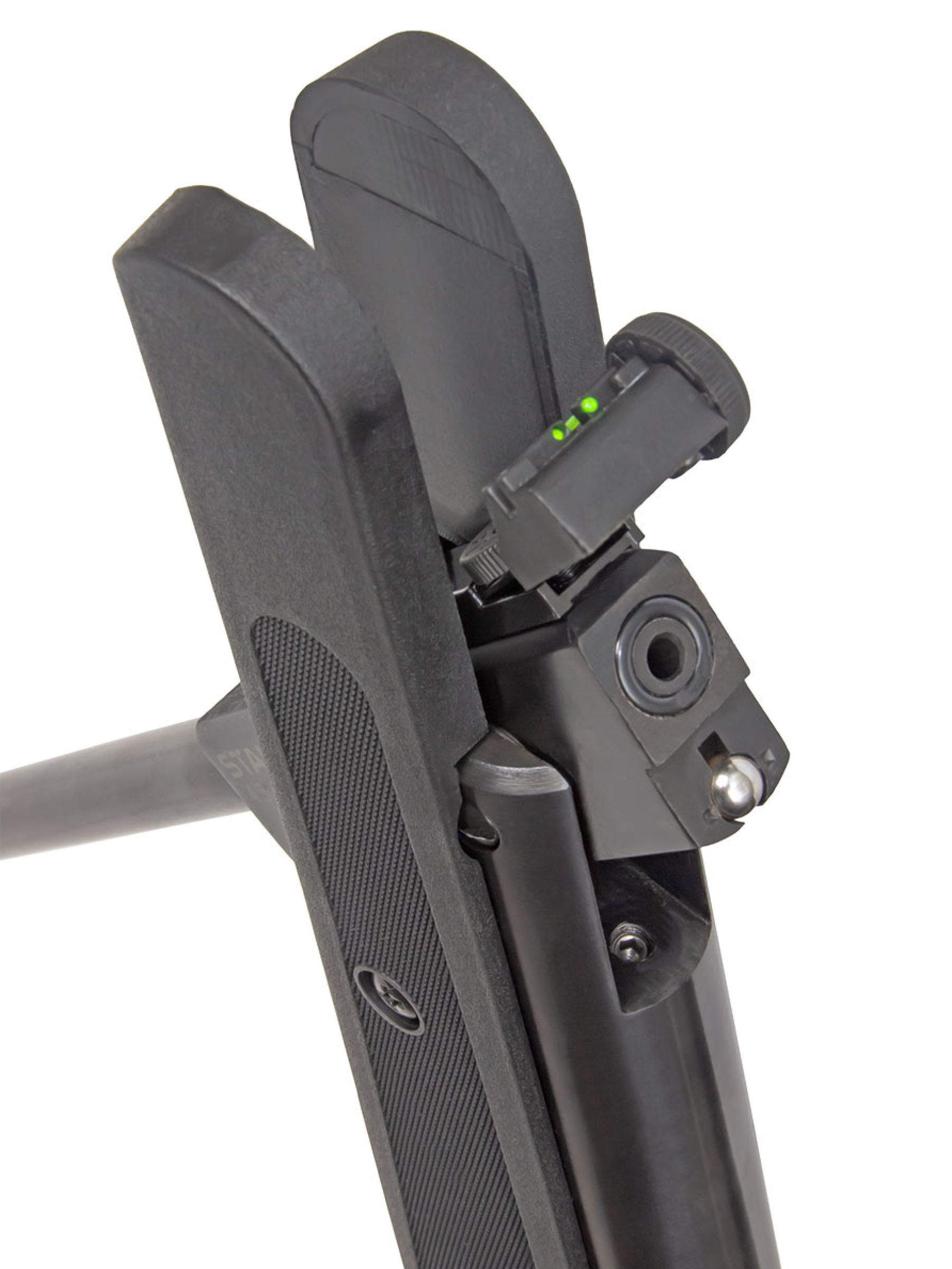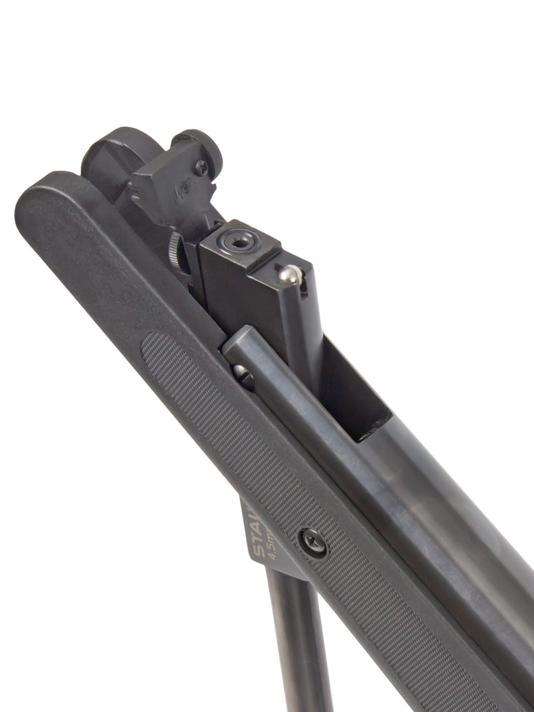 Пневматическая винтовка Stalker имеет открытые прицельные приспособления — неподвижную мушку и регулируемый целик с фибероптическими элементами, улучшающими прицеливание при плохой видимости. С помощью двух барабанчиков ввода поправок целик может регулироваться по горизонтали и вертикали.