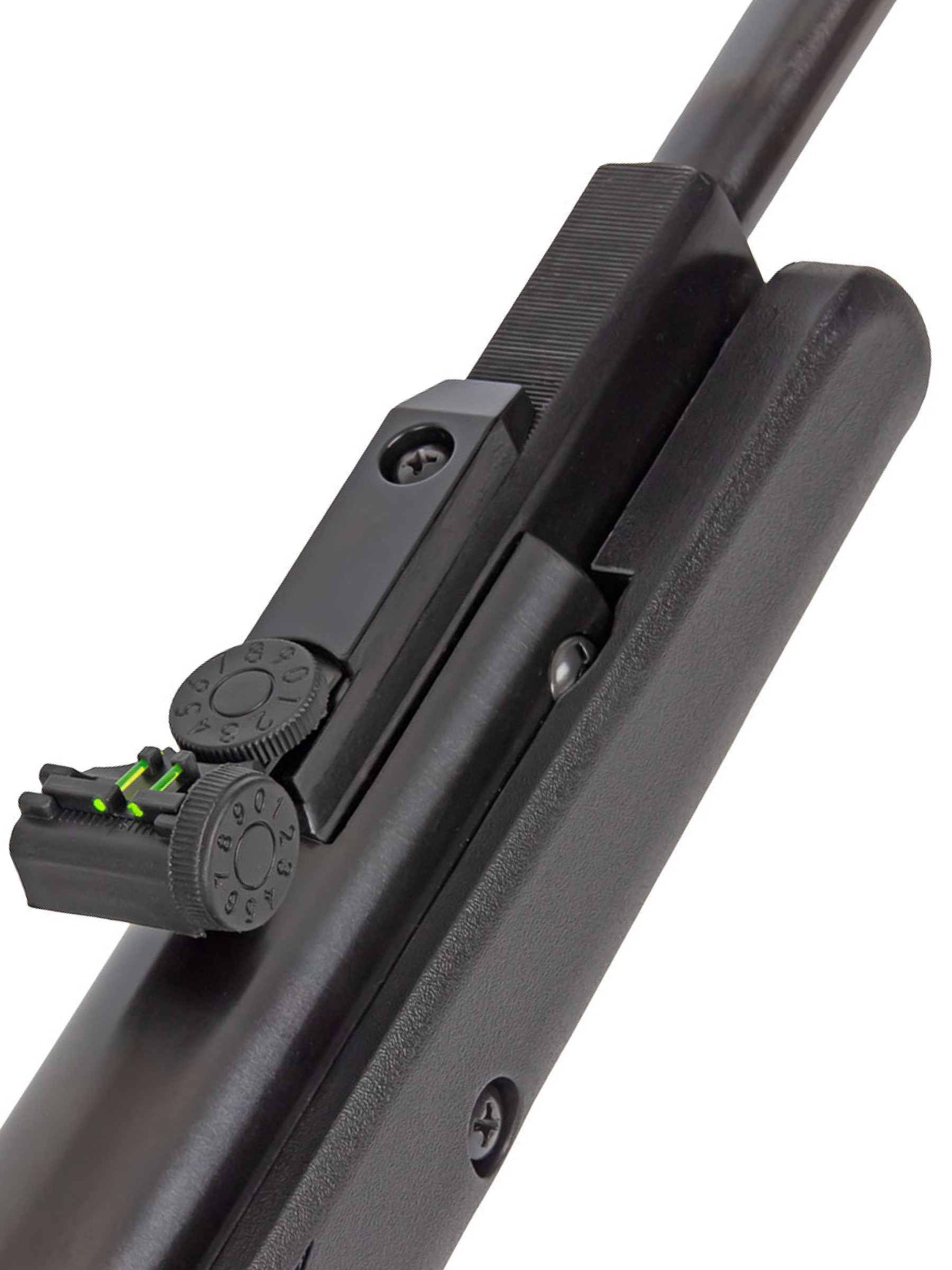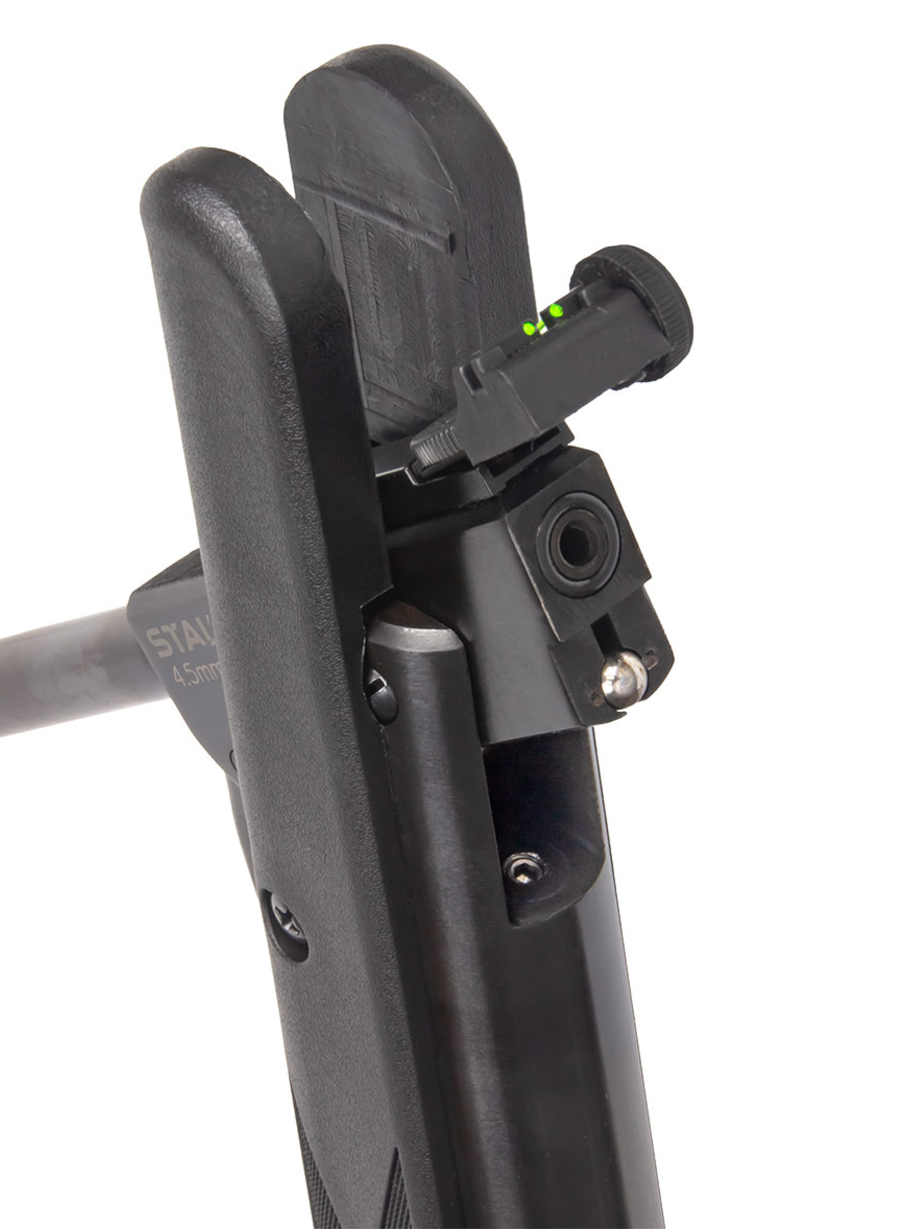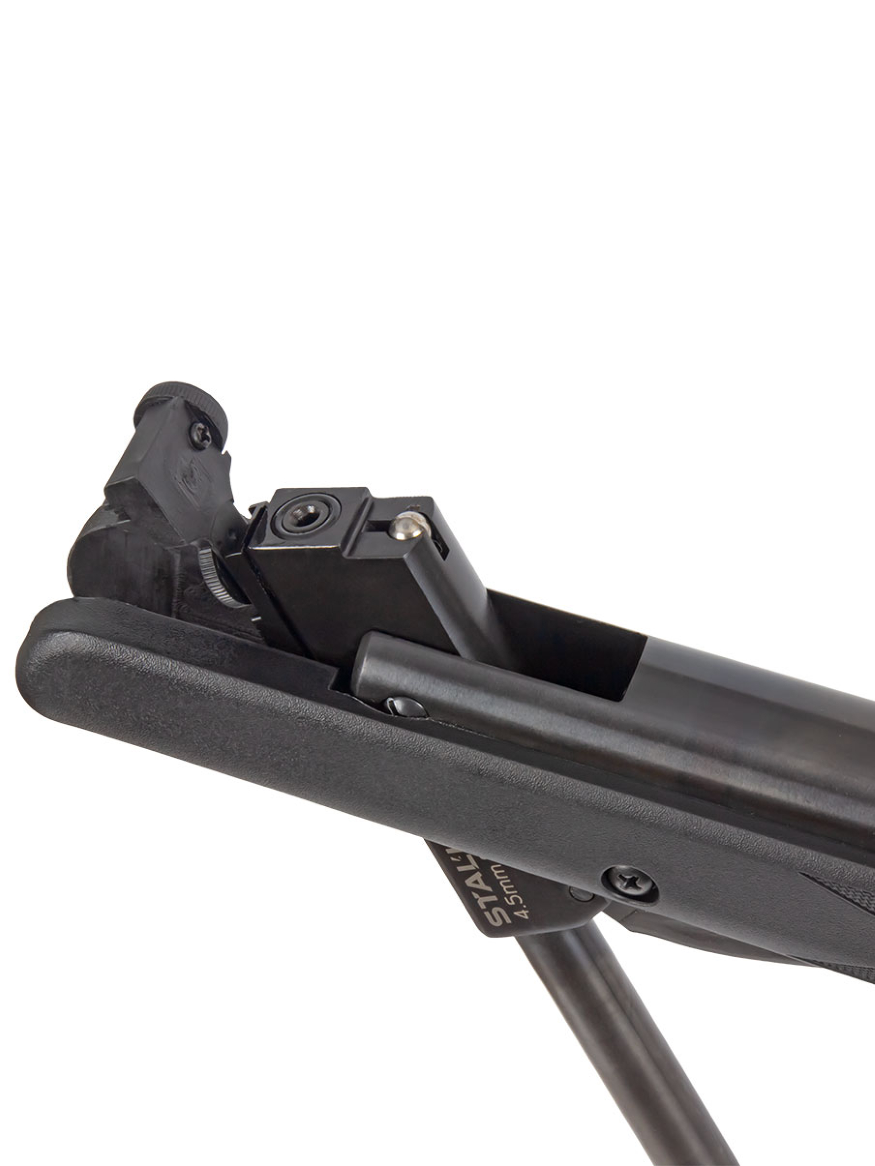 Пневматическая винтовка Stalker имеет открытые прицельные приспособления — неподвижную мушку и регулируемый целик с фибероптическими элементами, улучшающими прицеливание при плохой видимости. С помощью двух барабанчиков ввода поправок целик может регулироваться по горизонтали и вертикали.