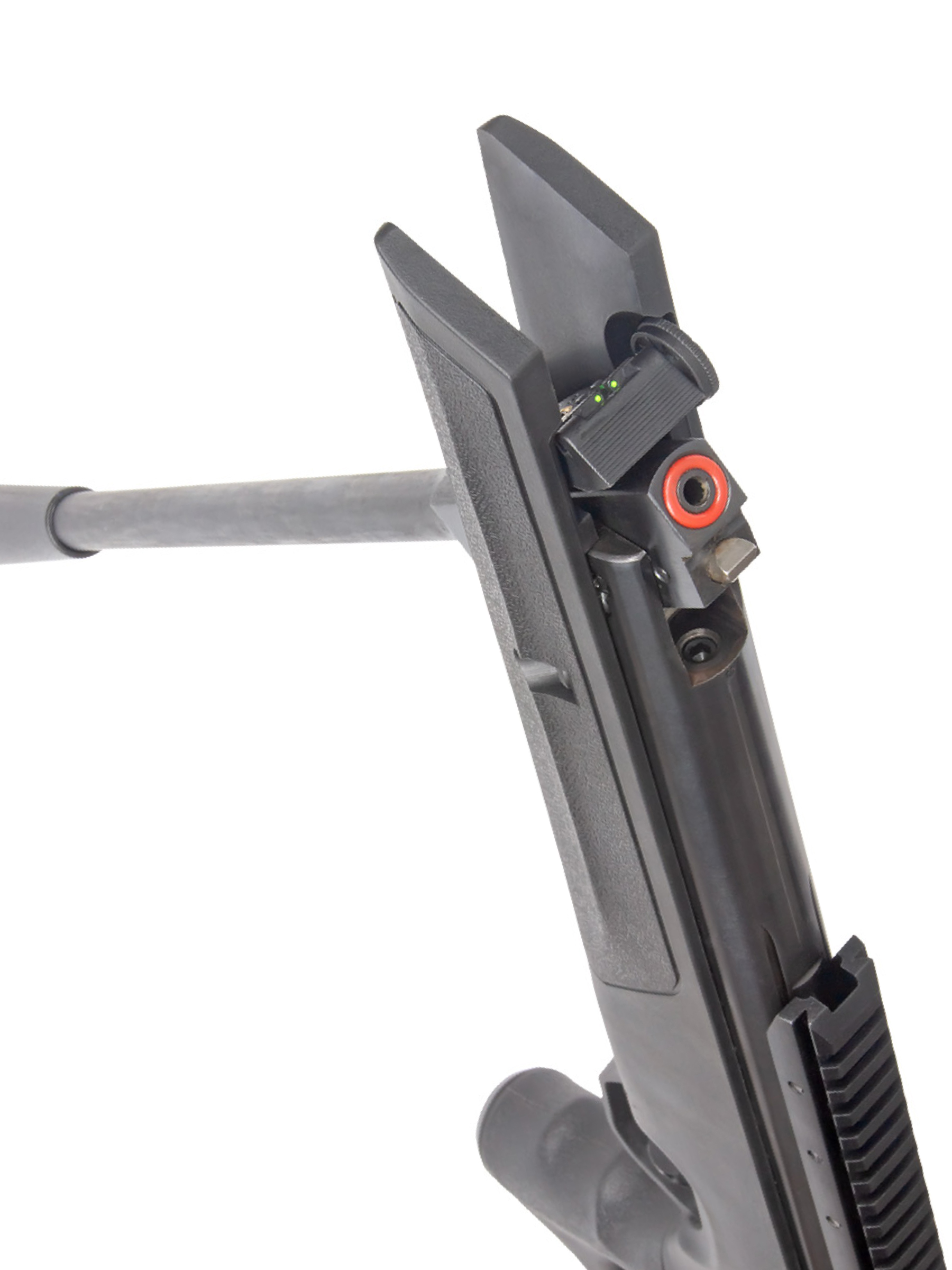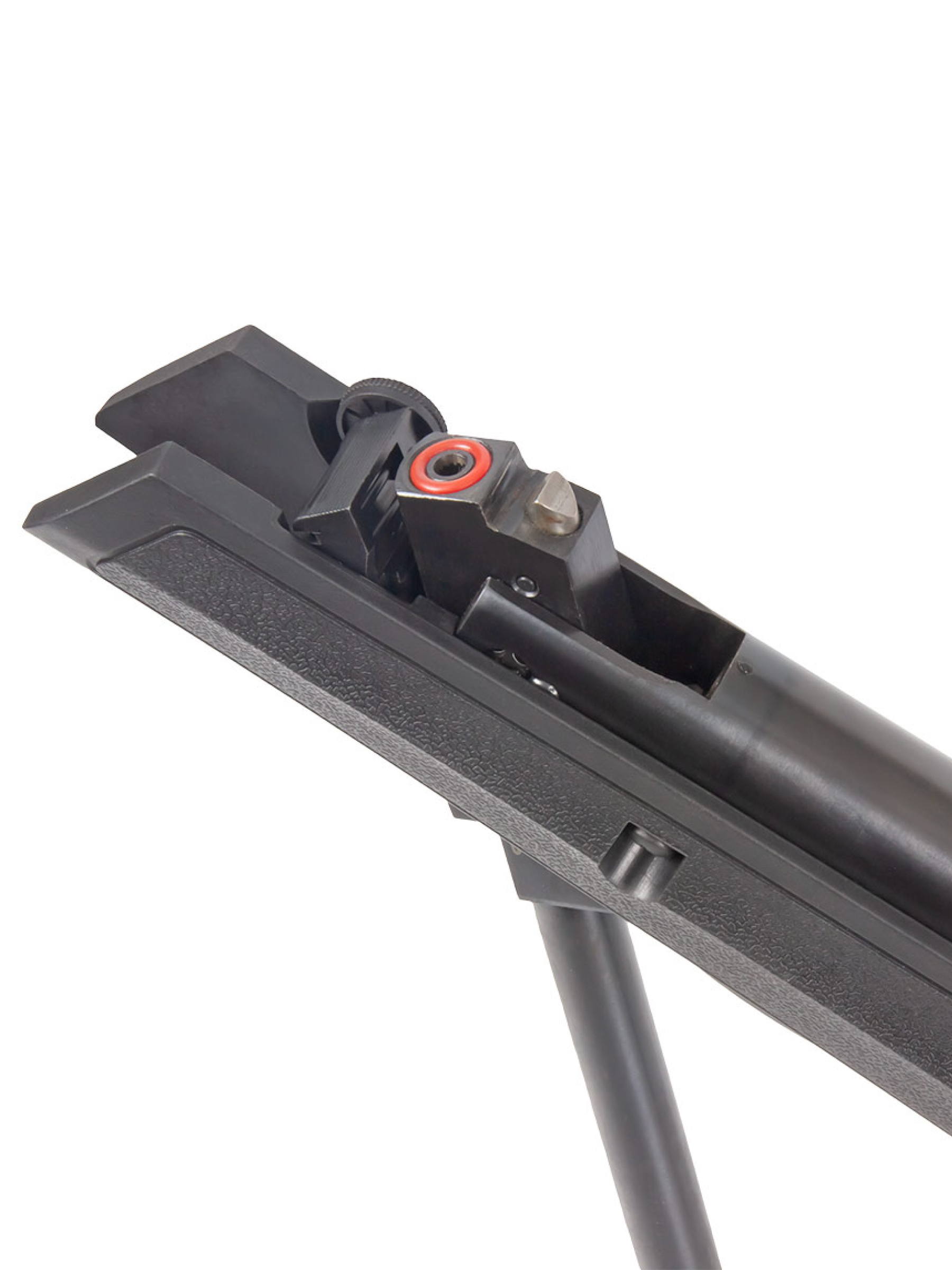 Пневматическая винтовка Stalker имеет открытые прицельные приспособления — неподвижную мушку и регулируемый целик с фибероптическими элементами, улучшающими прицеливание при плохой видимости. С помощью двух барабанчиков ввода поправок целик может регулироваться по горизонтали и вертикали.