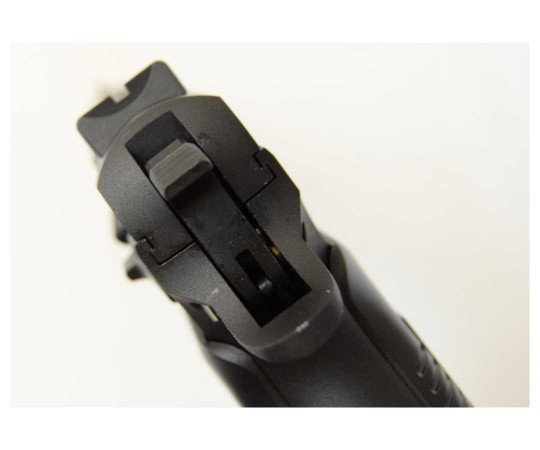 Данная модель полностью повторяет своего прототипа – как по внешнему виду, так и по конструкции. Дульный срез похож на боевой. Отличием является разве что утолщенная пятка магазина, а также маленькая эмблема бренда на правой стороне затвора. На боевом аналоге модели для защиты от случайного выстрела может быть установлен как флажковый предохранитель, так и рычаг безопасного спуска курка, в этой реплике используется именно флажковый предохранитель.