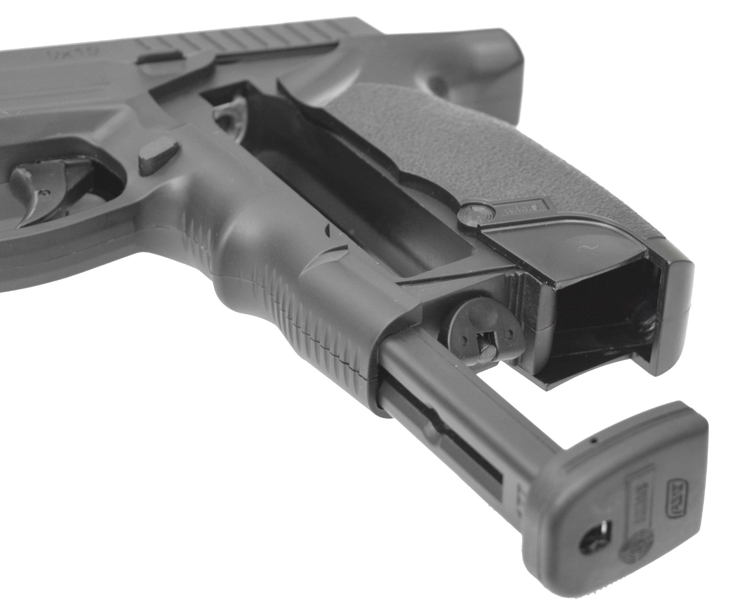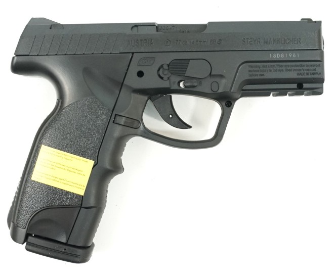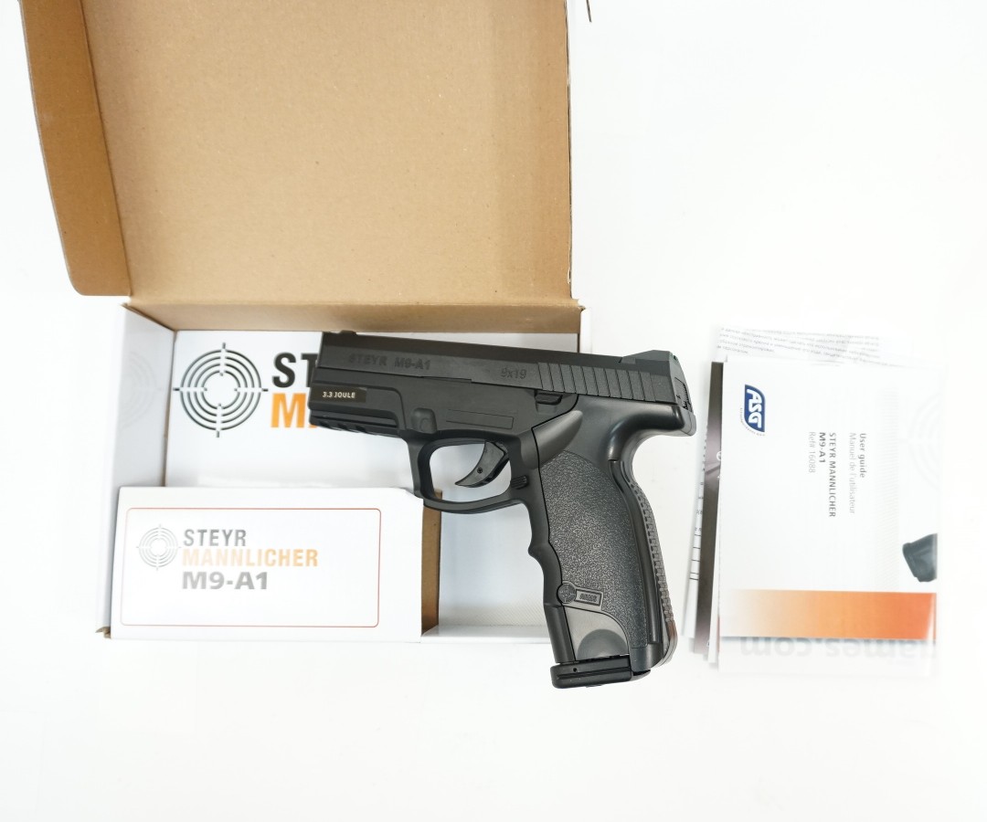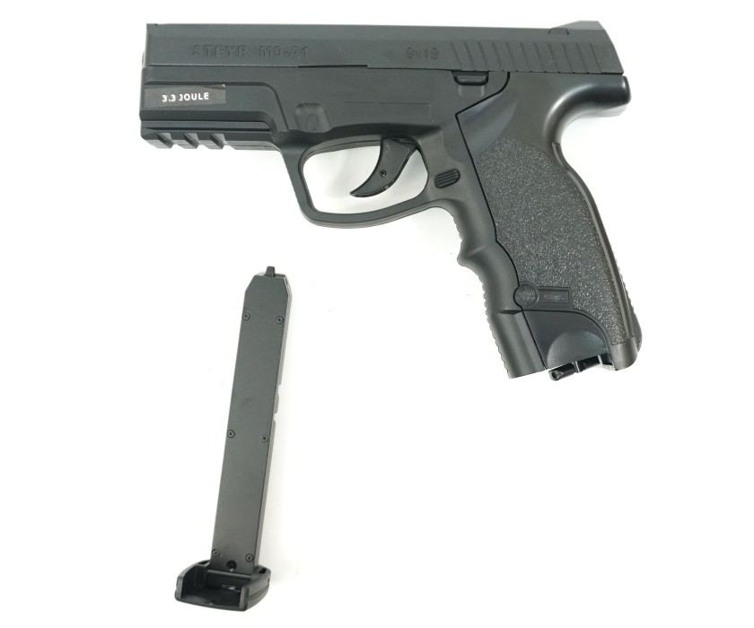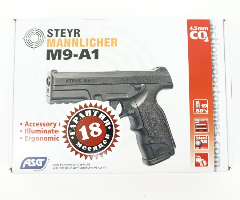 В магазине пневматического пистолета ASG Steyr Mannlicher M9-A1 вмещаются 19 шариков, стрельба идет самовзводом с большой скоростью, благодаря чему возможно эффективное использование оружия при тренировочной/спортивной стрельбе. Вследствие применения легких, прочных материалов на основе пластика вес пистолета максимум облегчен (до 523 грамм).