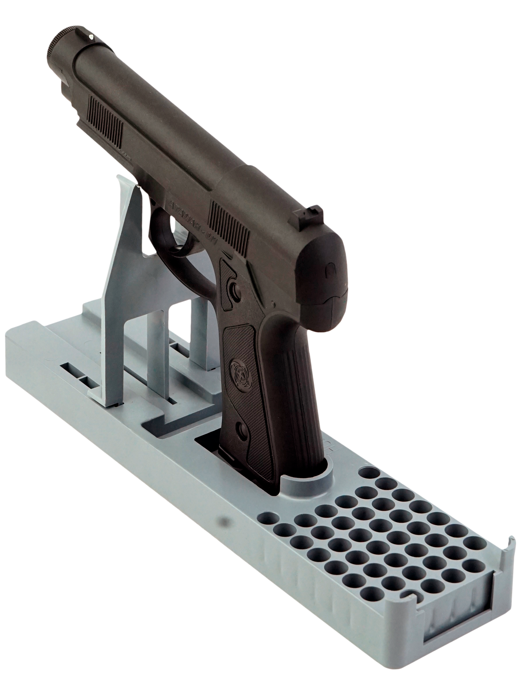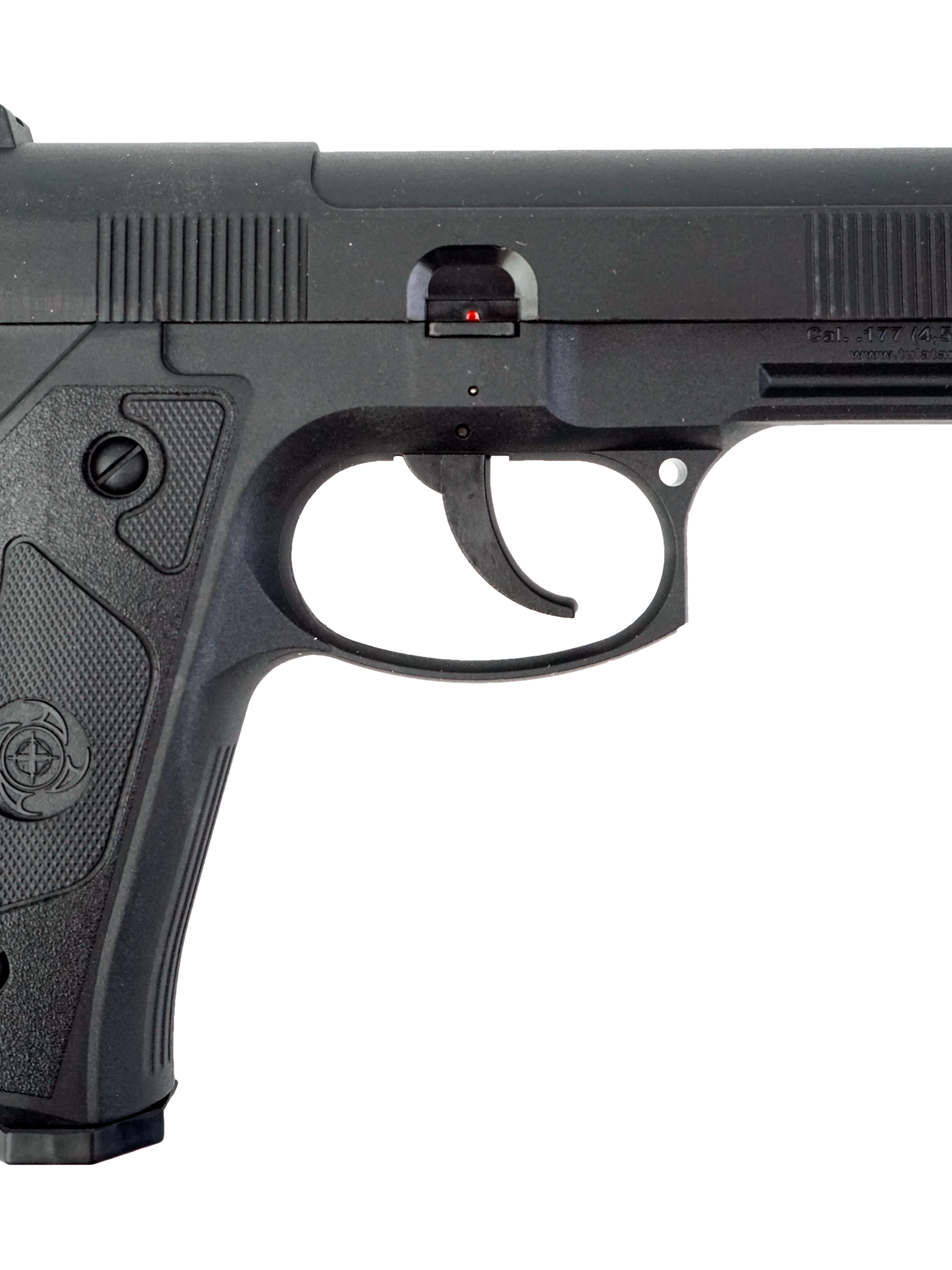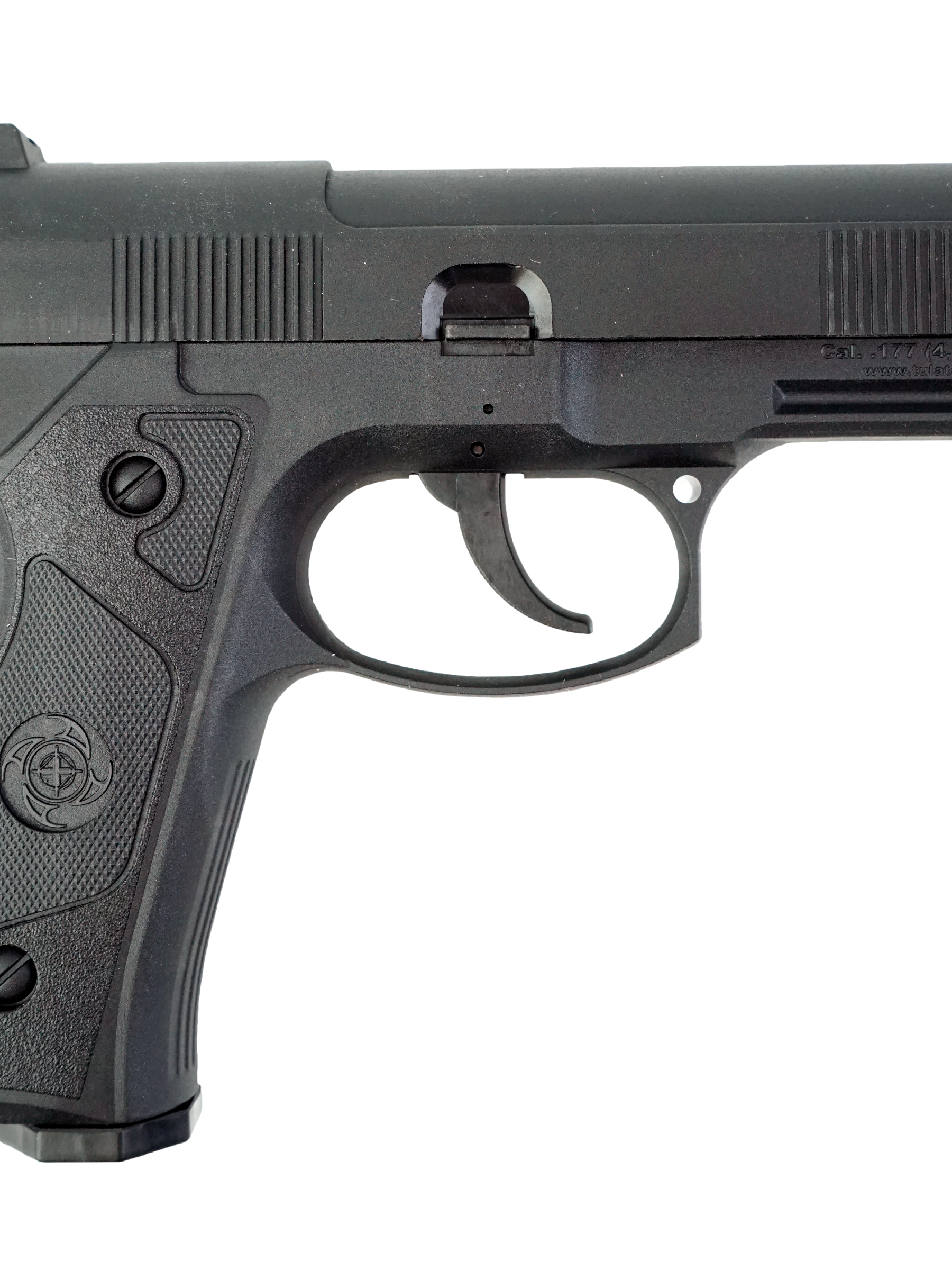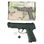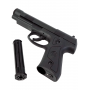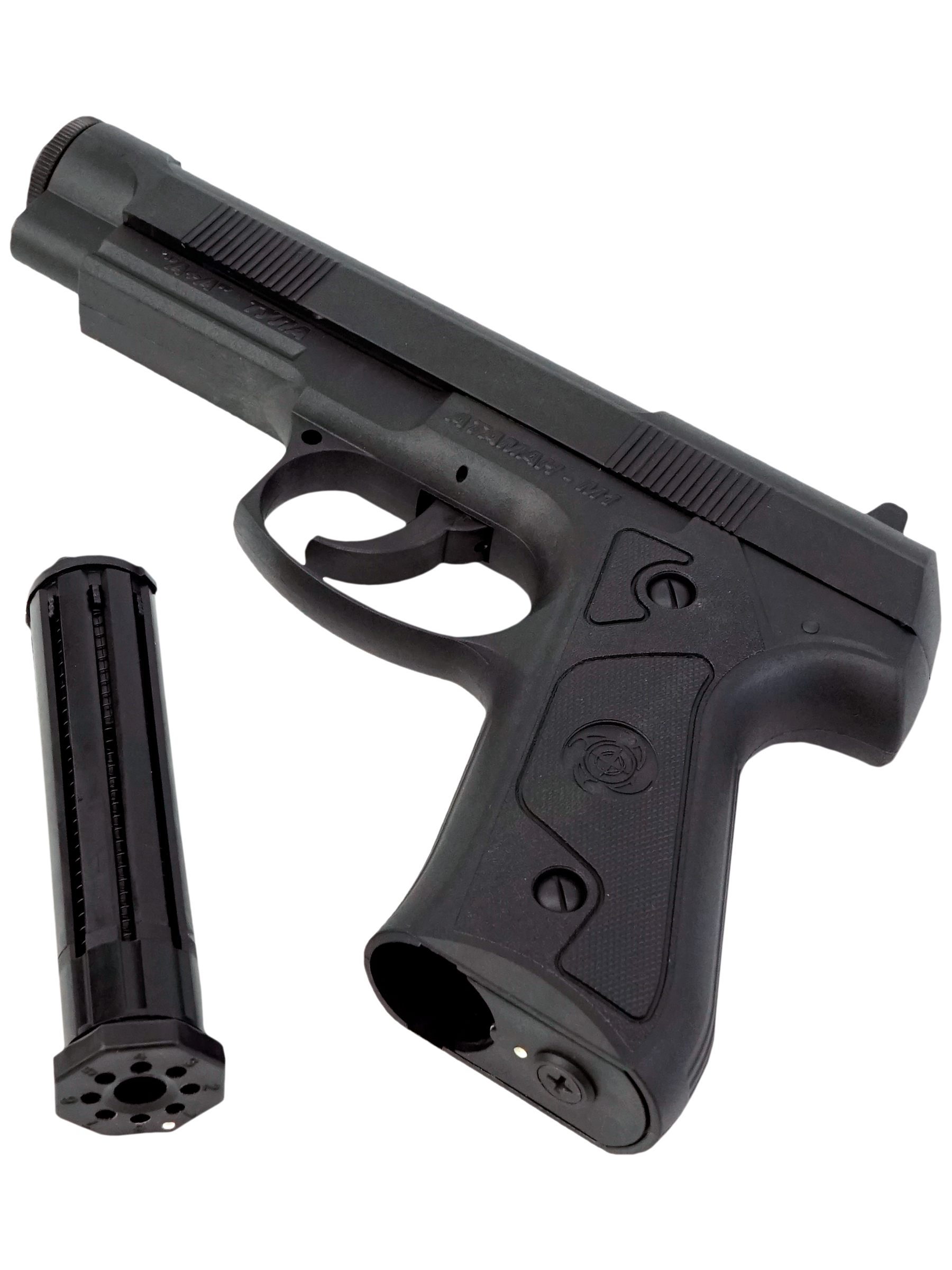 Съемный магазин пистолета обладает цилиндрической формой с 8 отсеками, каждый из которых вмещает 15 боеприпасов. В результате, общая емкость магазина помещает в себе 120 пуль. В виде пуль применяются шарики цилиндрической формы из стали, калибр которых - 4,5 мм. Скорость пули прилична и равна 125-140 м/сек. Такая скорость осуществляется, благодаря системе подвижного ствола. По мощности изделие имеет дульную энергию до 3 Дж.