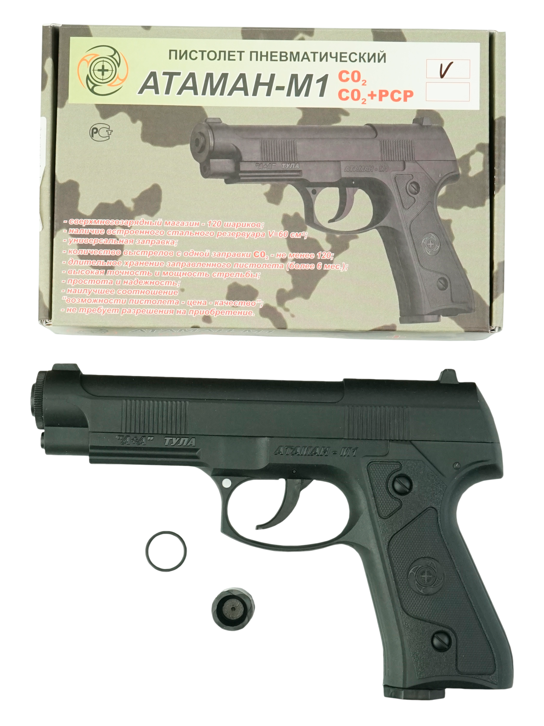 Помимо основного изделия в комплектацию пневматического пистолета Атаман-М1 входит уплотнительное кольцо, двусторонняя гайка для прокола баллонов, технический паспорт. Данная модель обладает надежностью, прочностью, удобством при применении, благодаря конструкции, материалам, самовзводу, мягкому спуску, возможности заправки различными способами, хорошей меткости и простоте применения.
